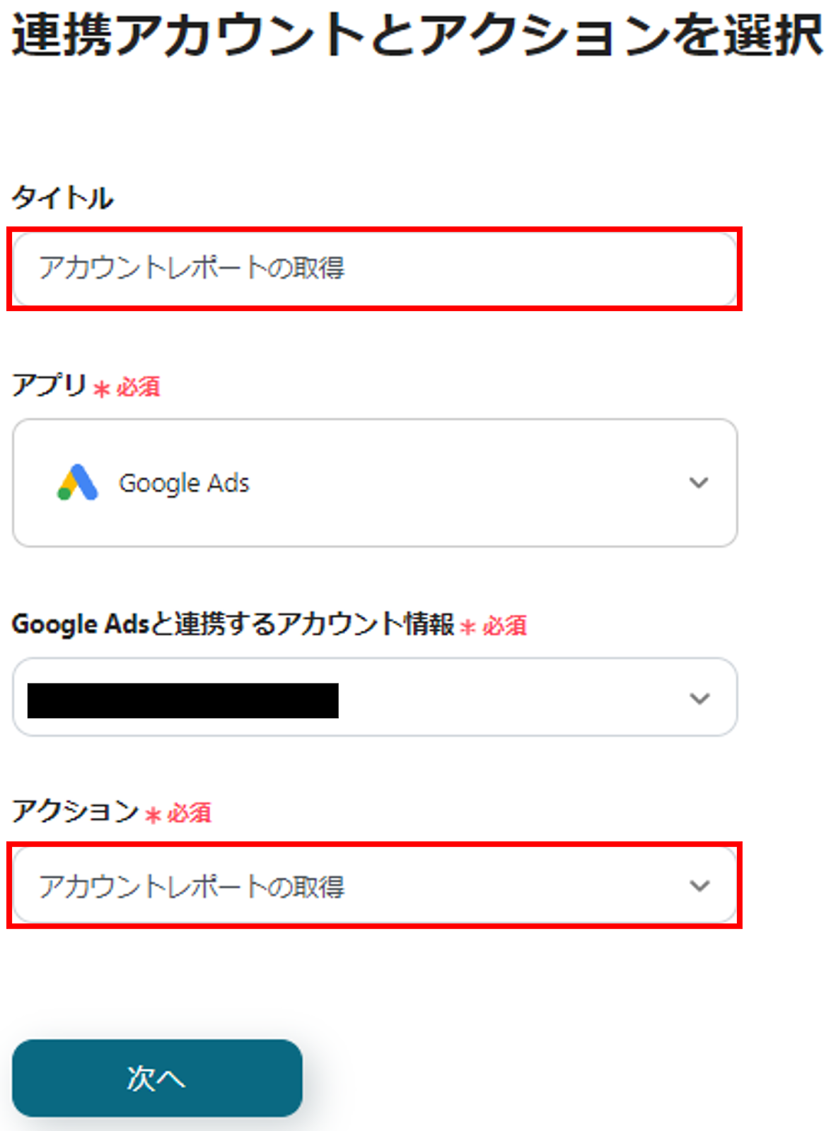 (2)タイトルを設定し、アクションに「アカウントレポートの取得」が選択されていることを確認したら「次へ」をクリックします。
