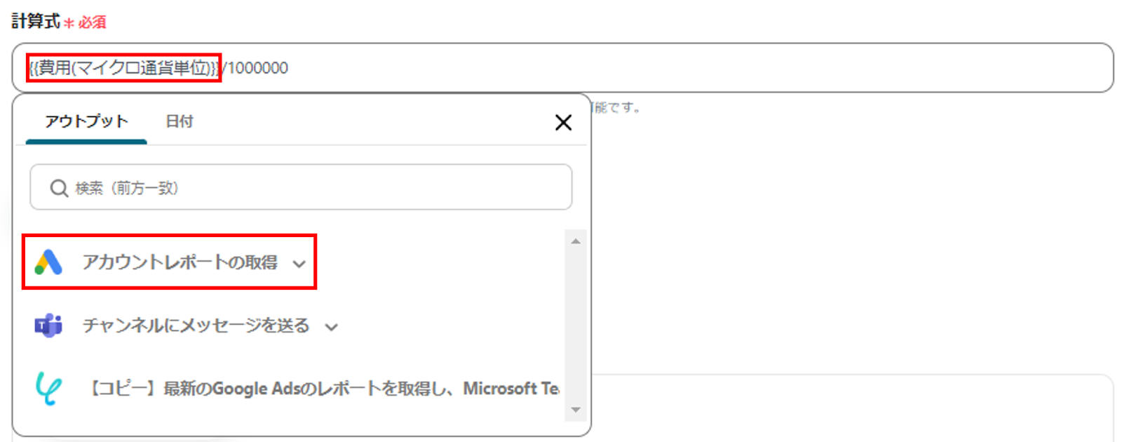 (7)計算式には今回、「アカウントレポートの取得」の中からアウトプットを選び直して設定します。