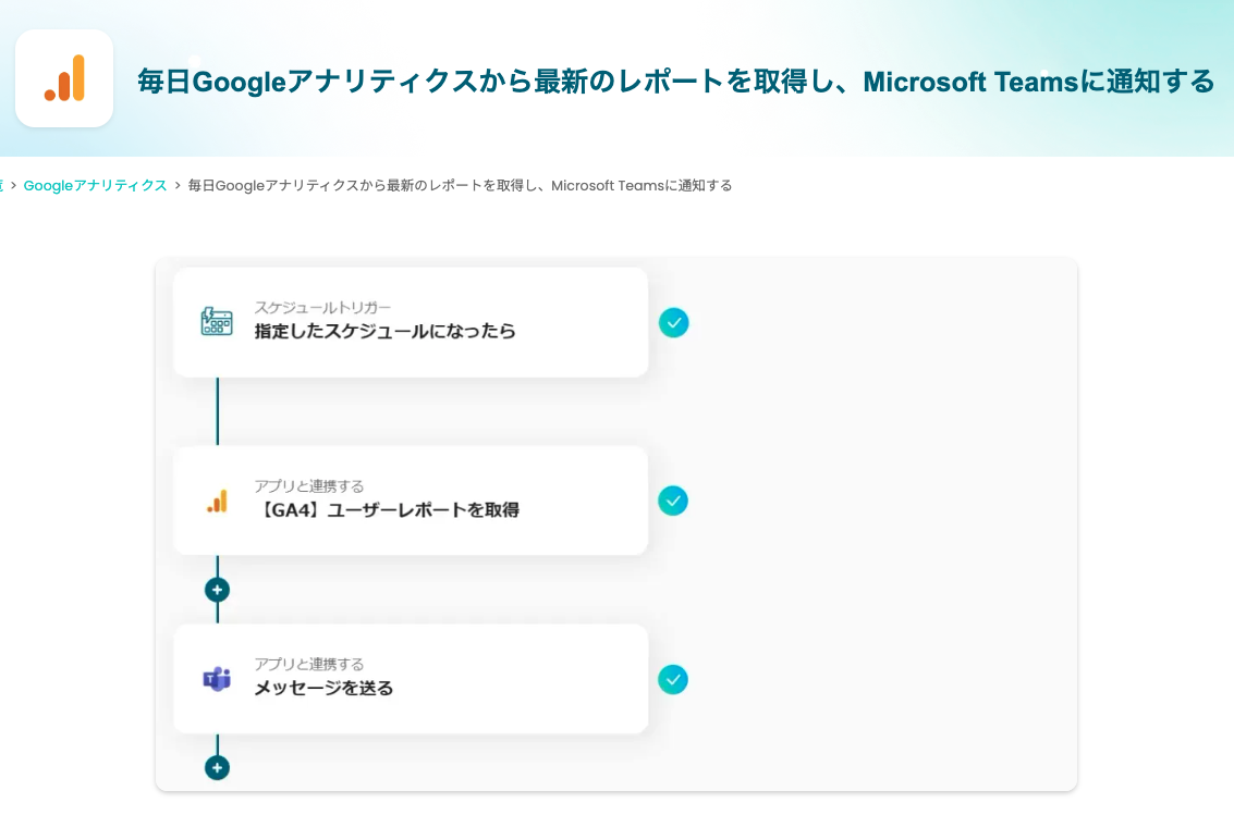 ここから「毎日Google アナリティクスから最新のレポートを取得し、Microsoft Teamsに通知する」自動化を、Yoomのテンプレートを使い、ノーコードで実装する方法を解説します。