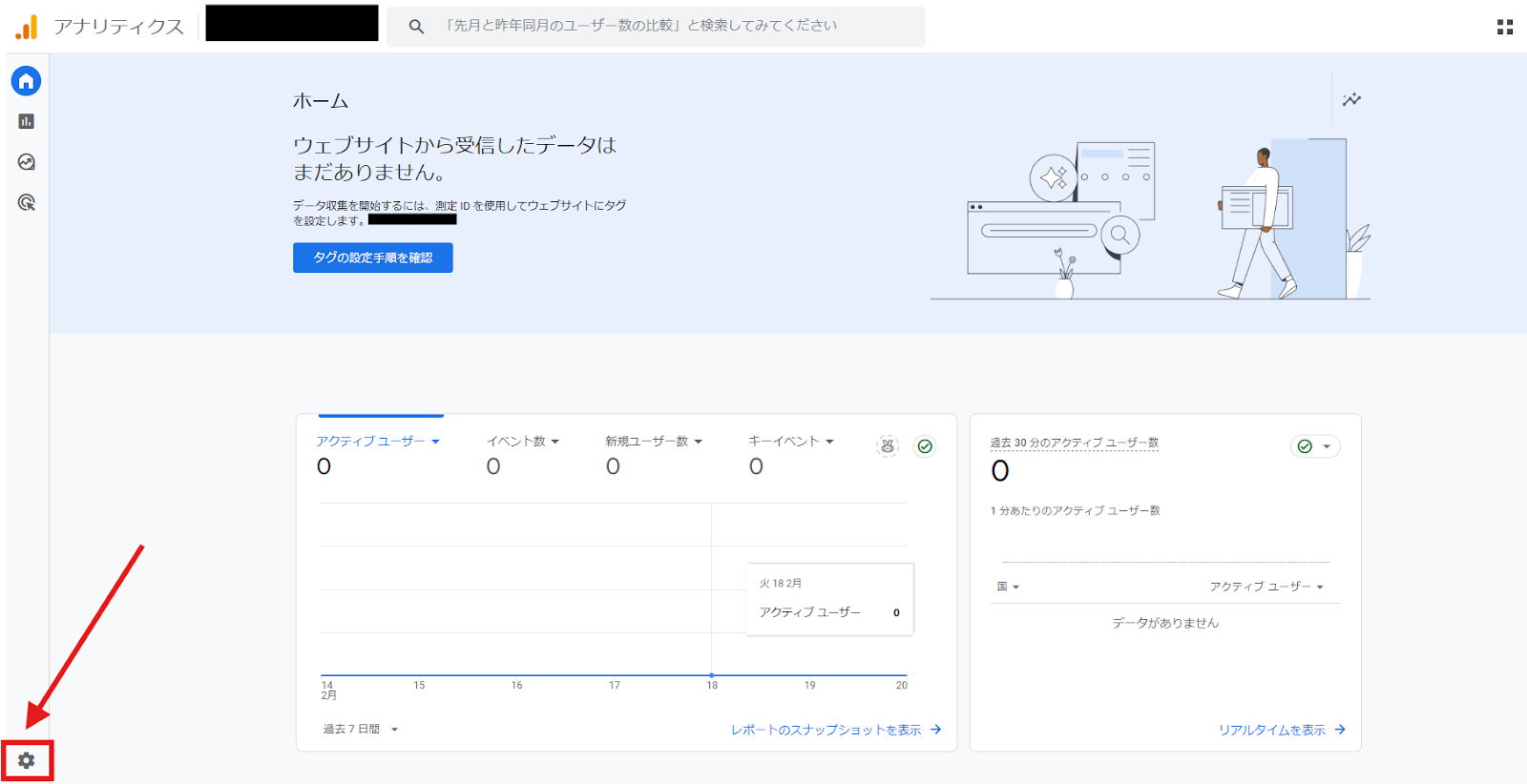 Google アナリティクスにログインし、左下の歯車マークをクリックしましょう。