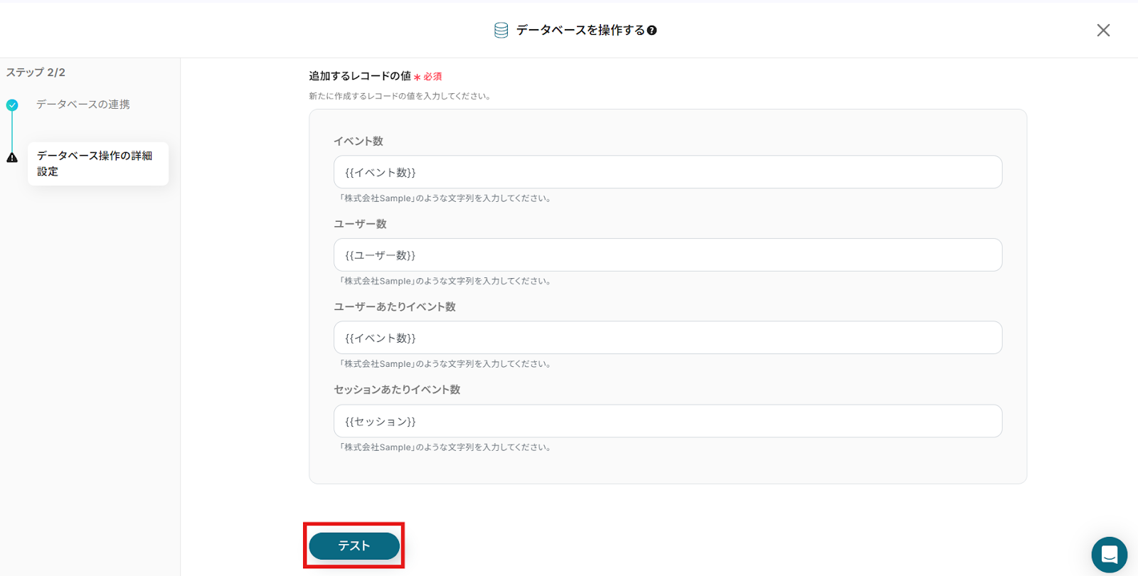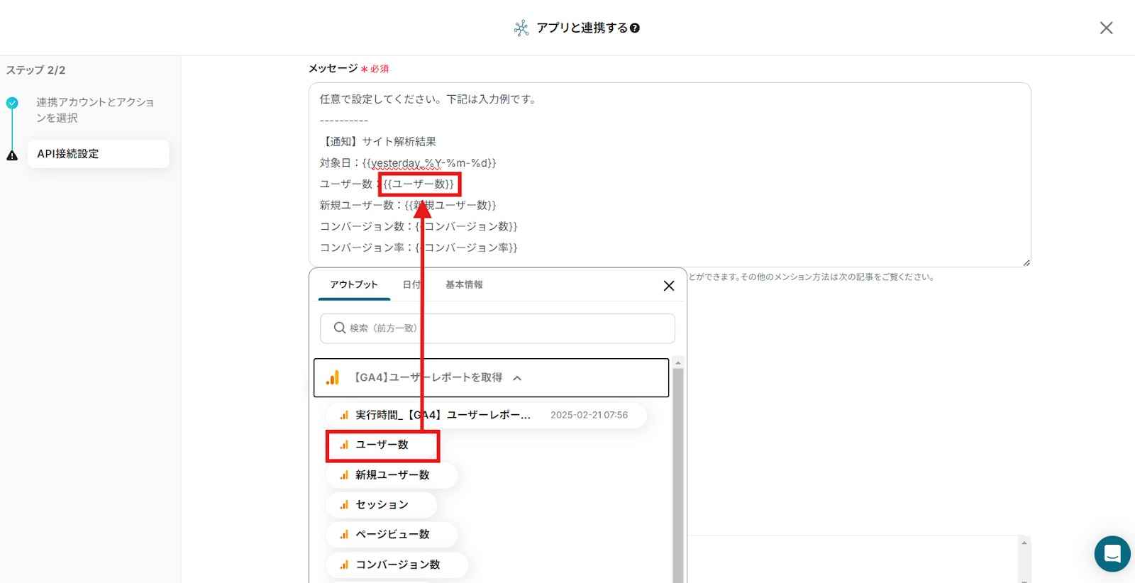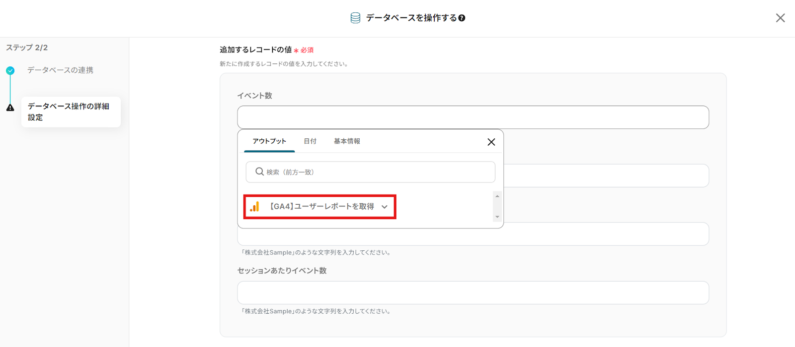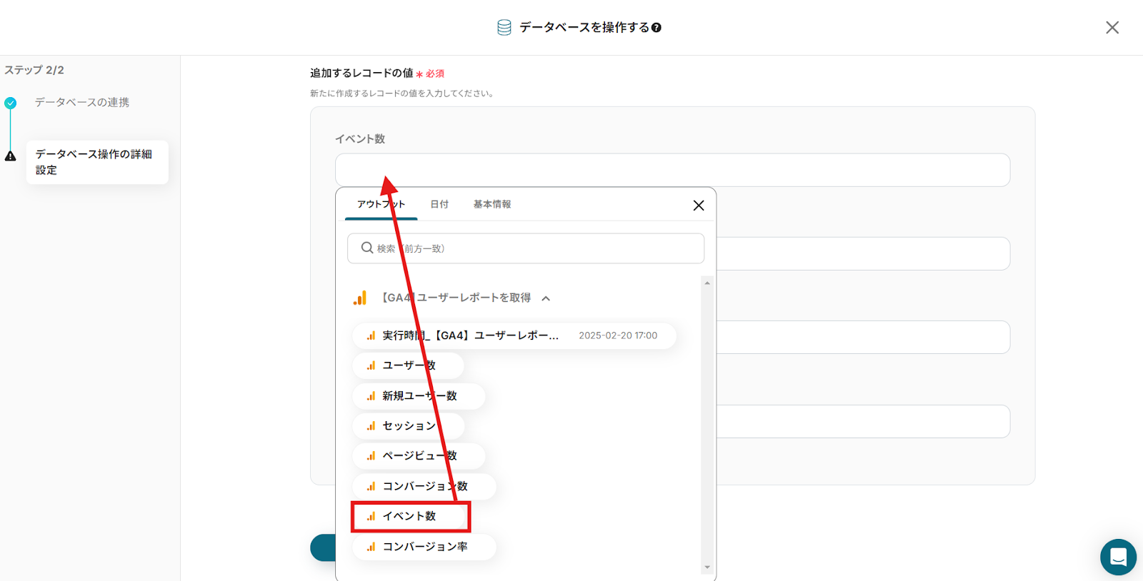 取得したデータが一覧表示されるため、選択したボックス名に等しいデータをクリックで挿入しましょう。画像の場合ボックス名が「イベント数」のため、データも「イベント数」を選択しています。