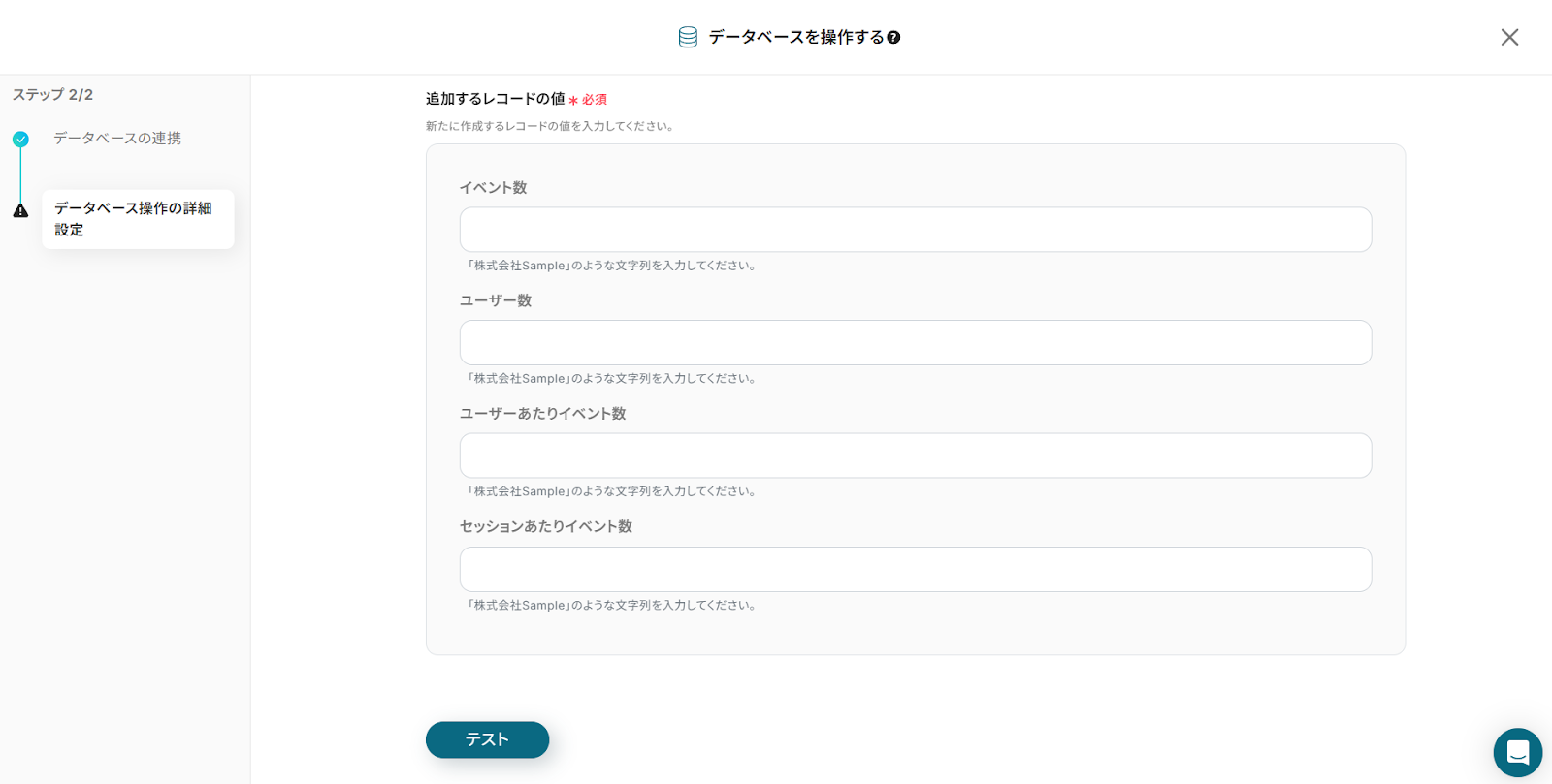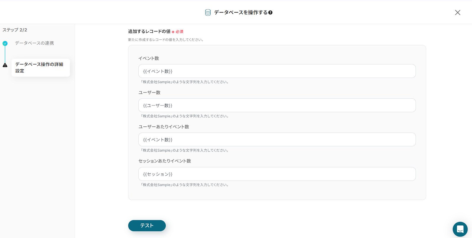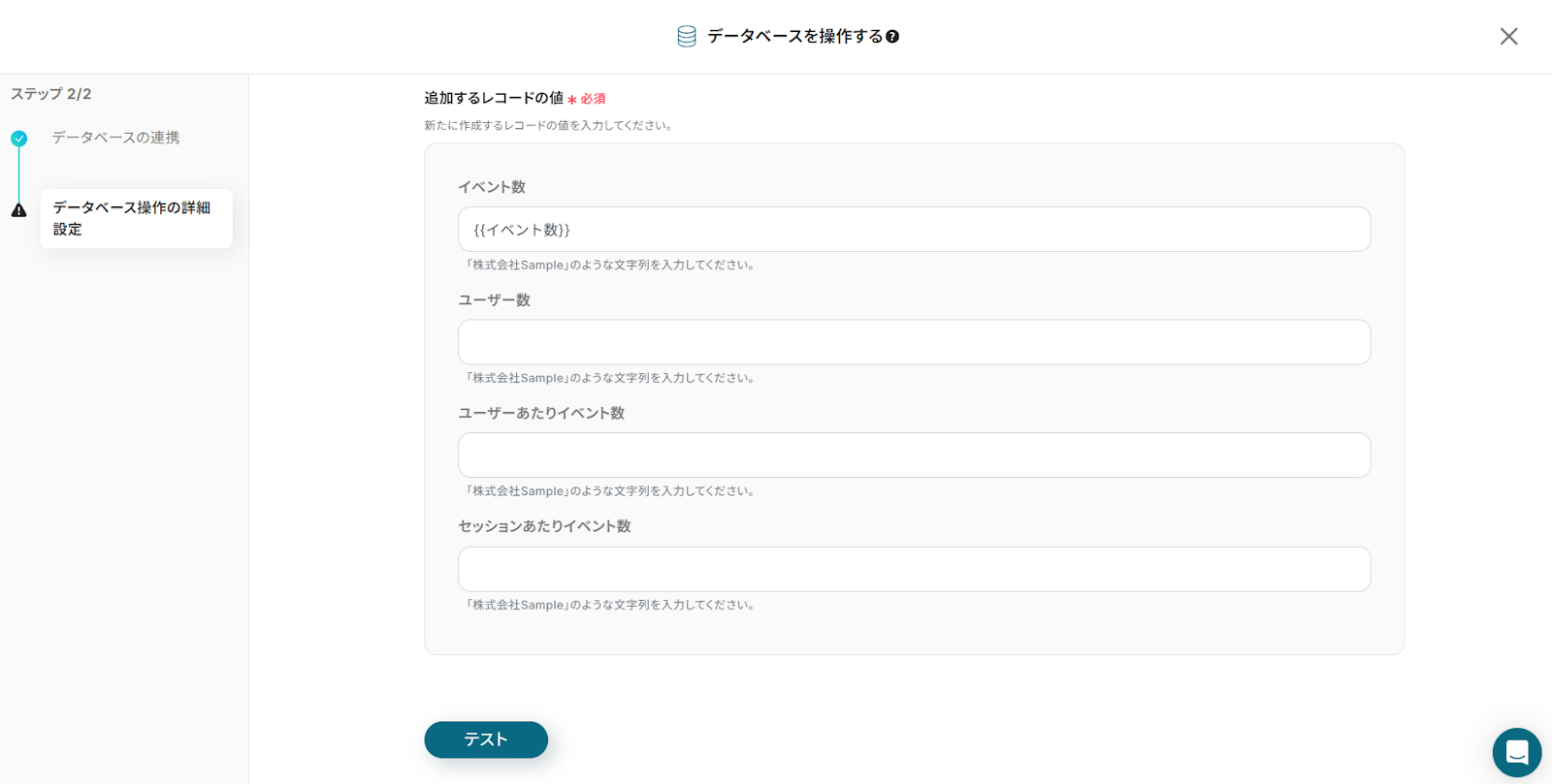 取得したデータが一覧表示されるため、選択したボックス名に等しいデータをクリックで挿入しましょう。画像の場合ボックス名が「イベント数」のため、データも「イベント数」を選択しています。