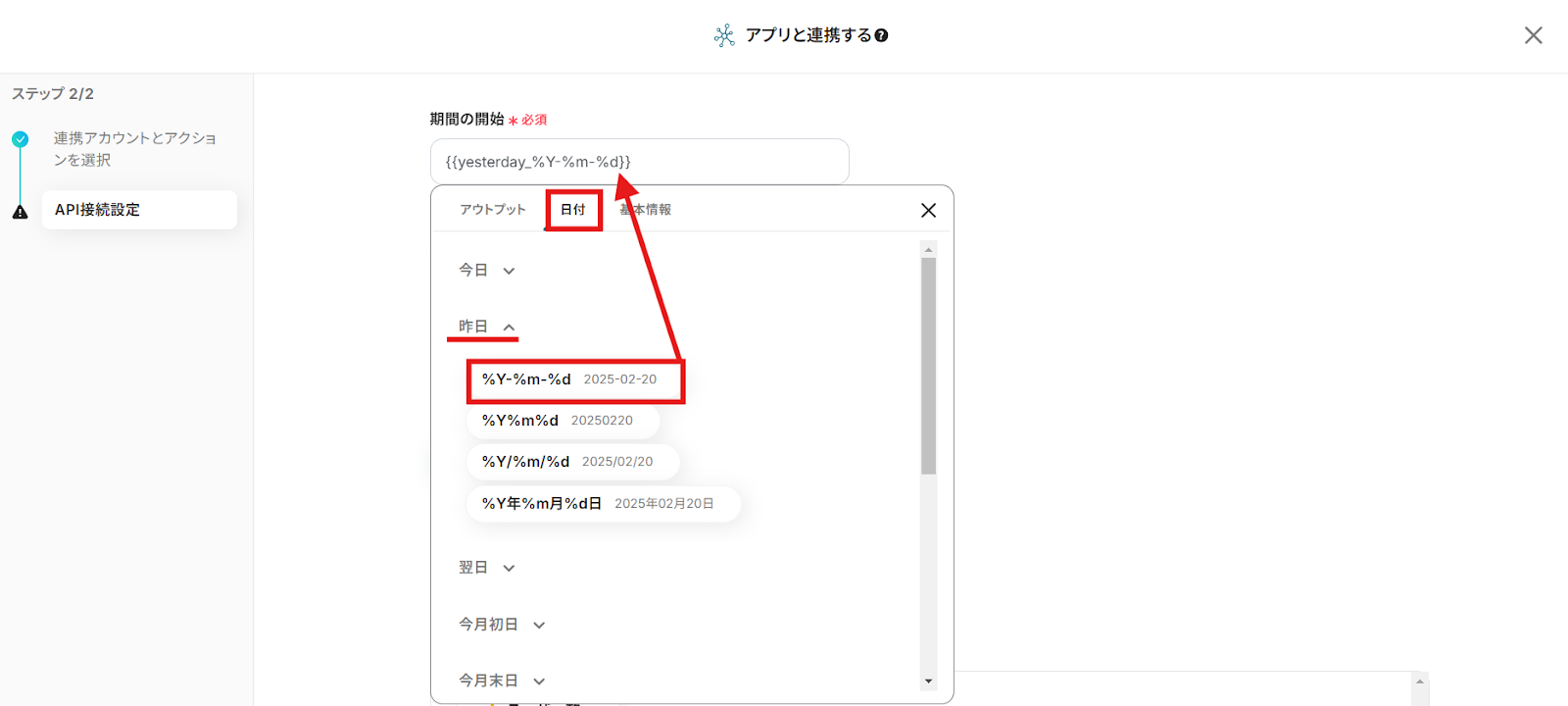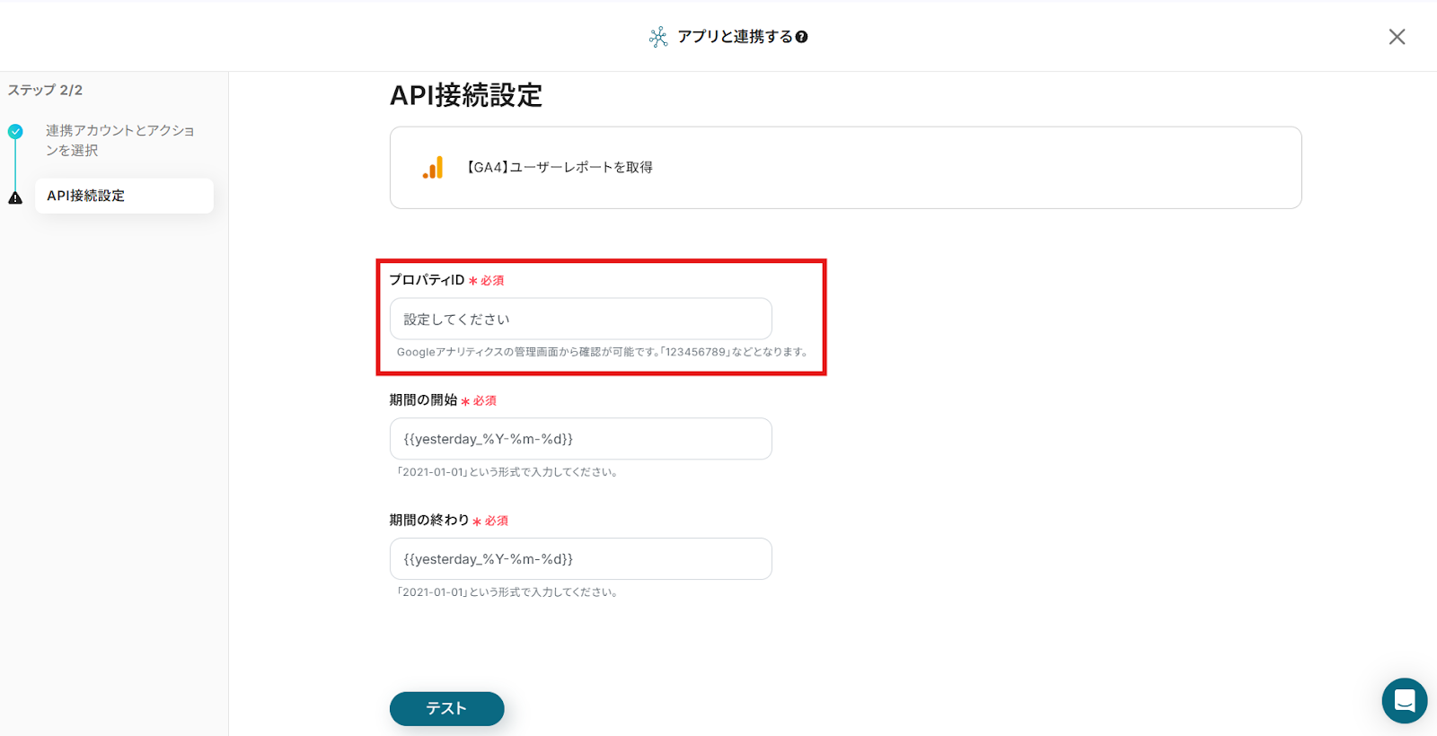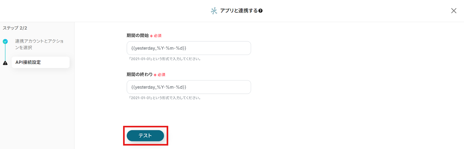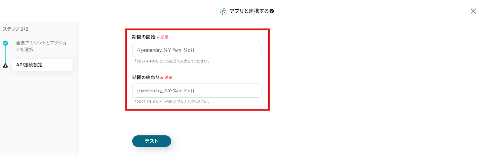期間の開始と期間の終わりは、いつからいつまでのデータを取得するかという設定になります。