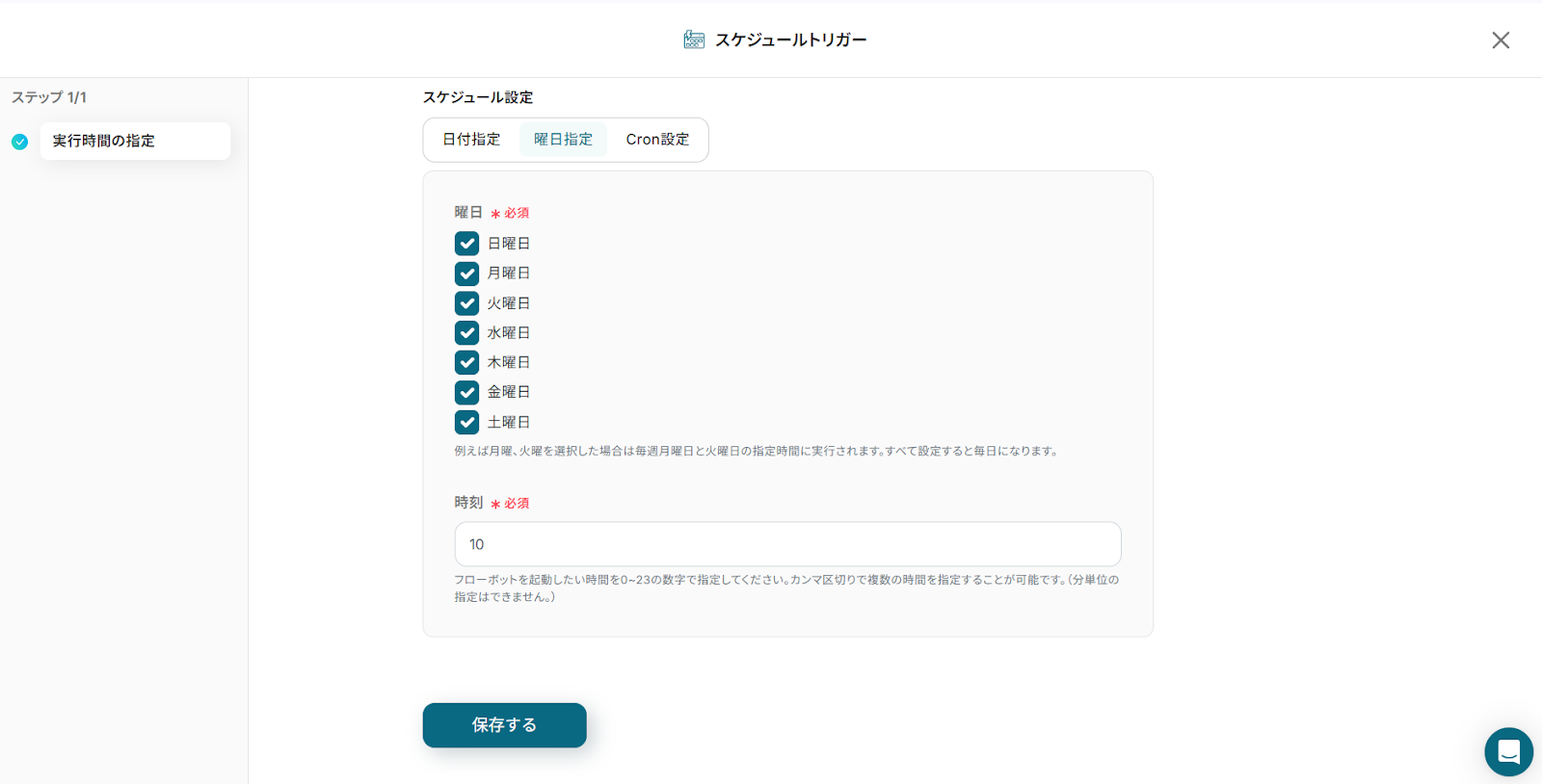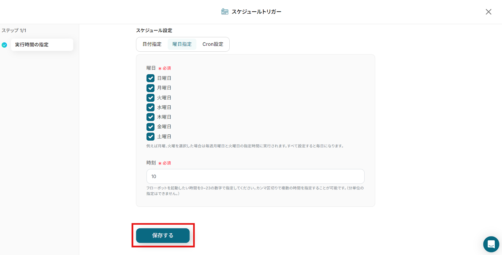 画像の設定では、毎日朝10時にフローが起動する設定になっています。希望がある場合は数字を変更し、任意で修正しましょう!