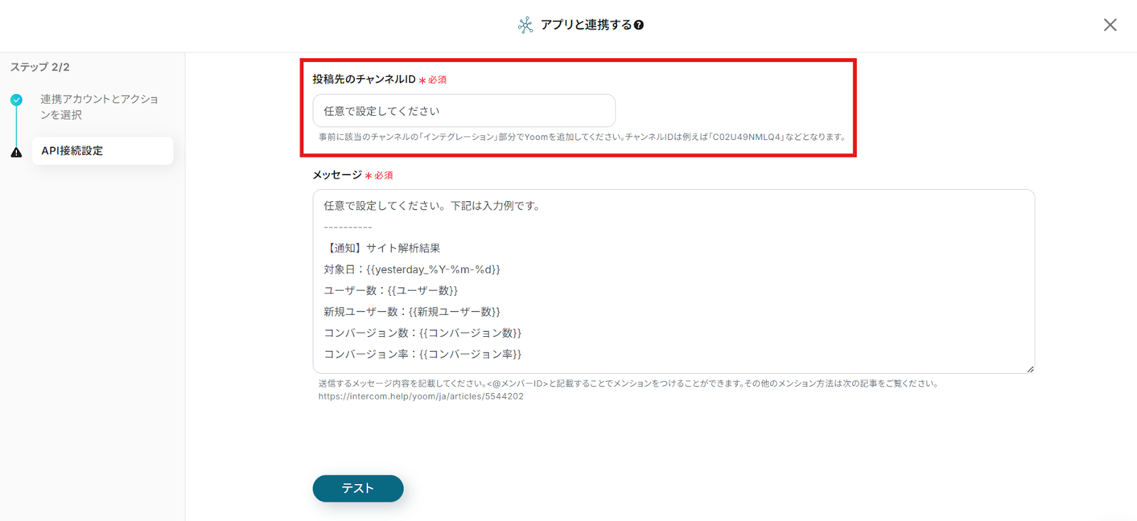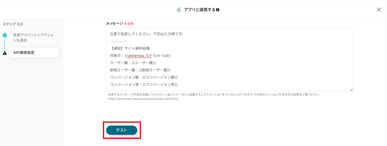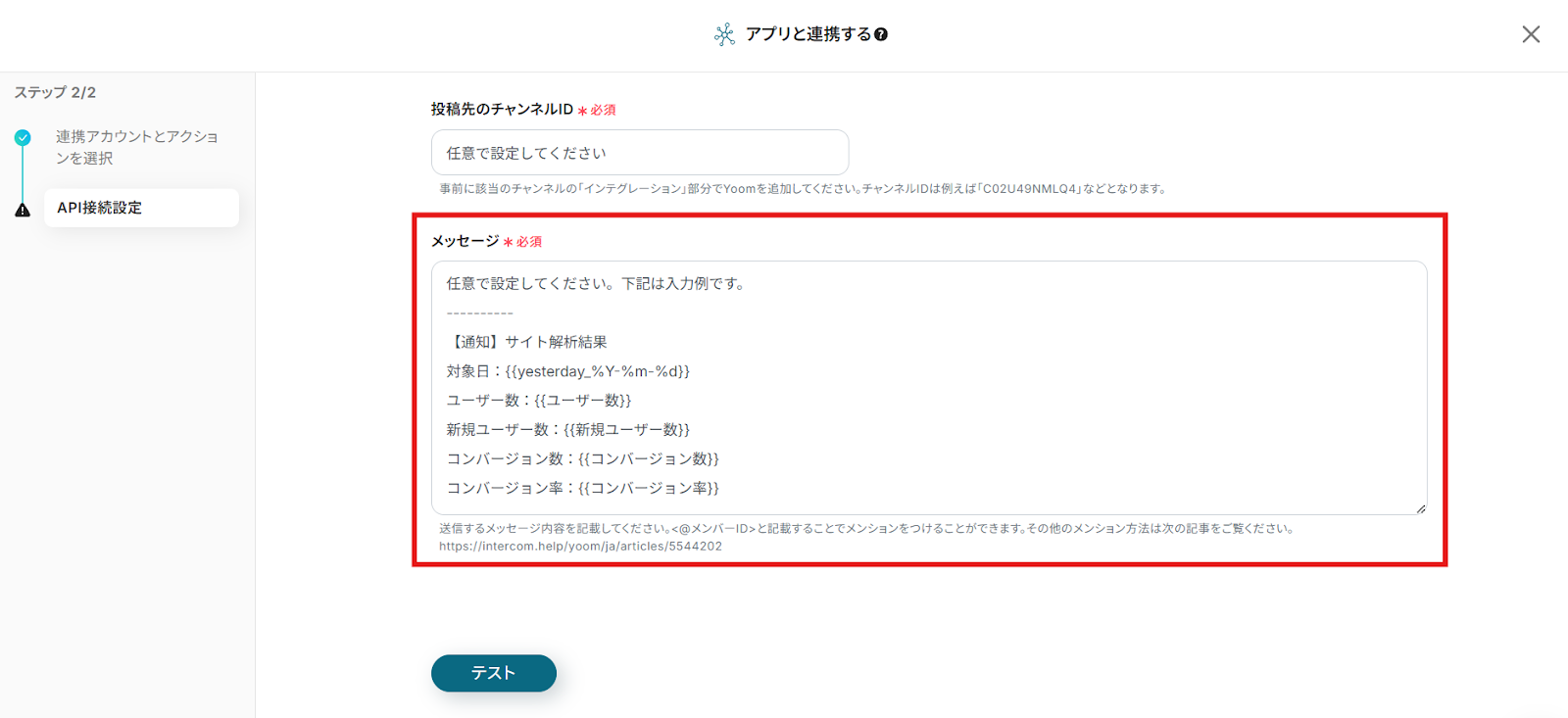 メッセージの設定ができたら、下部にあるテストボタンを押してください。