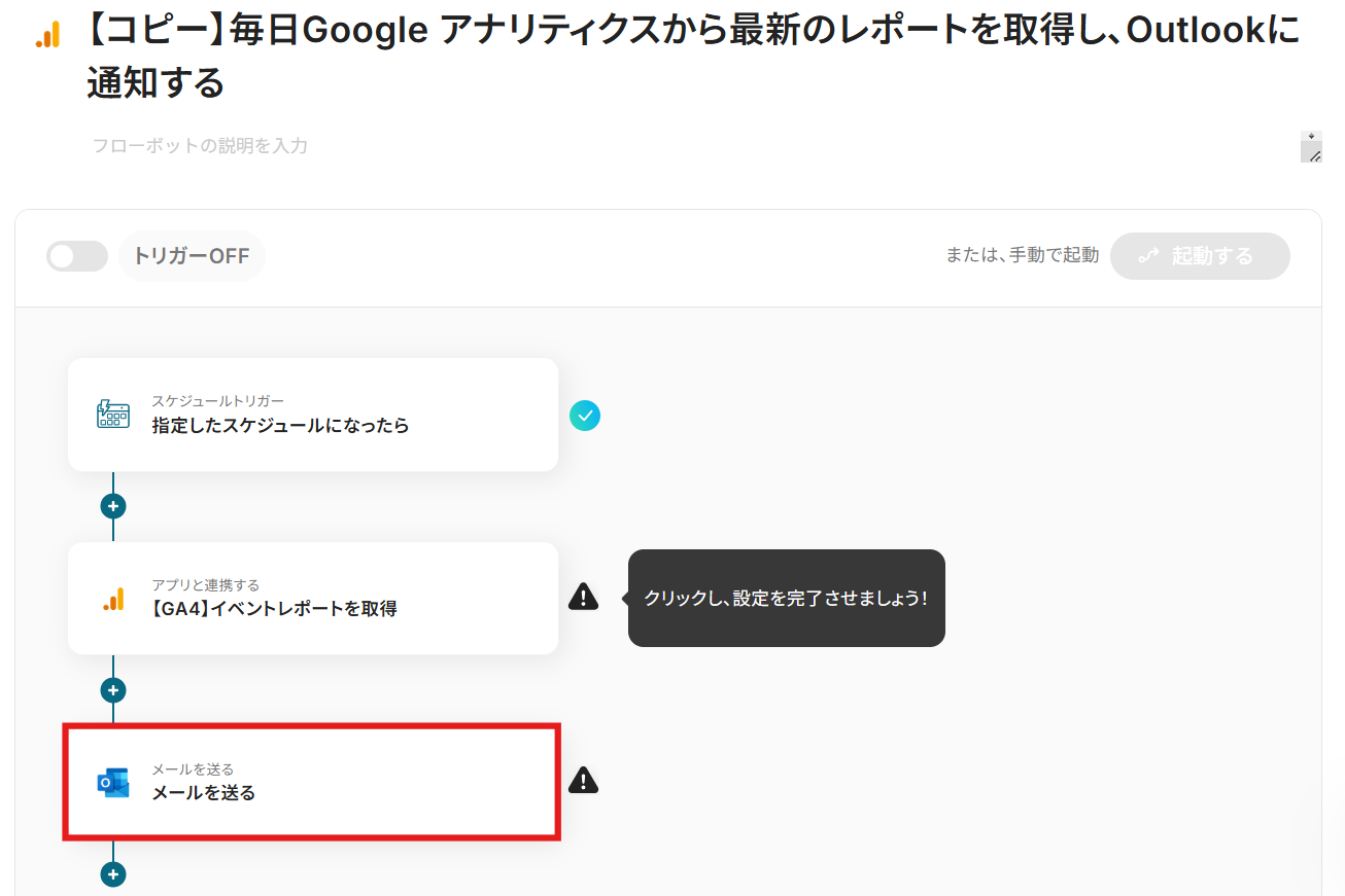 先ほど設定したテンプレートから派生し、こちらはGoogle アナリティクスの前日のレポートをOutlookを使用してメールを送信するフローとなっています。