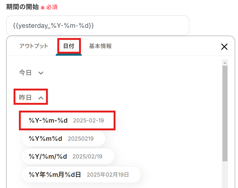 昨日のレポートを取得するため、「日付」→「昨日」→「%Y-%m-%d」の順でクリックしてください。