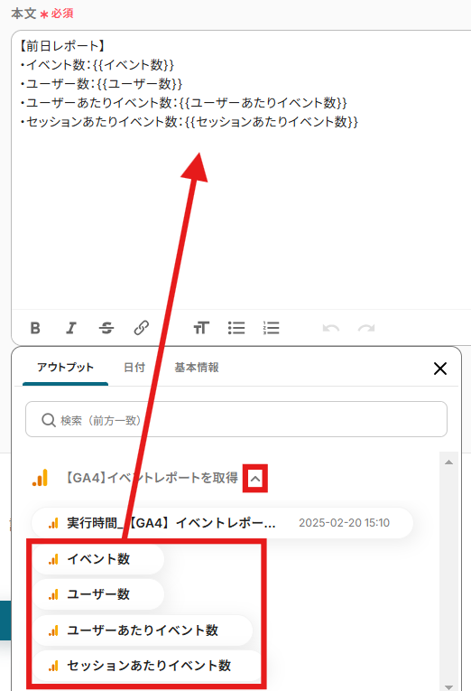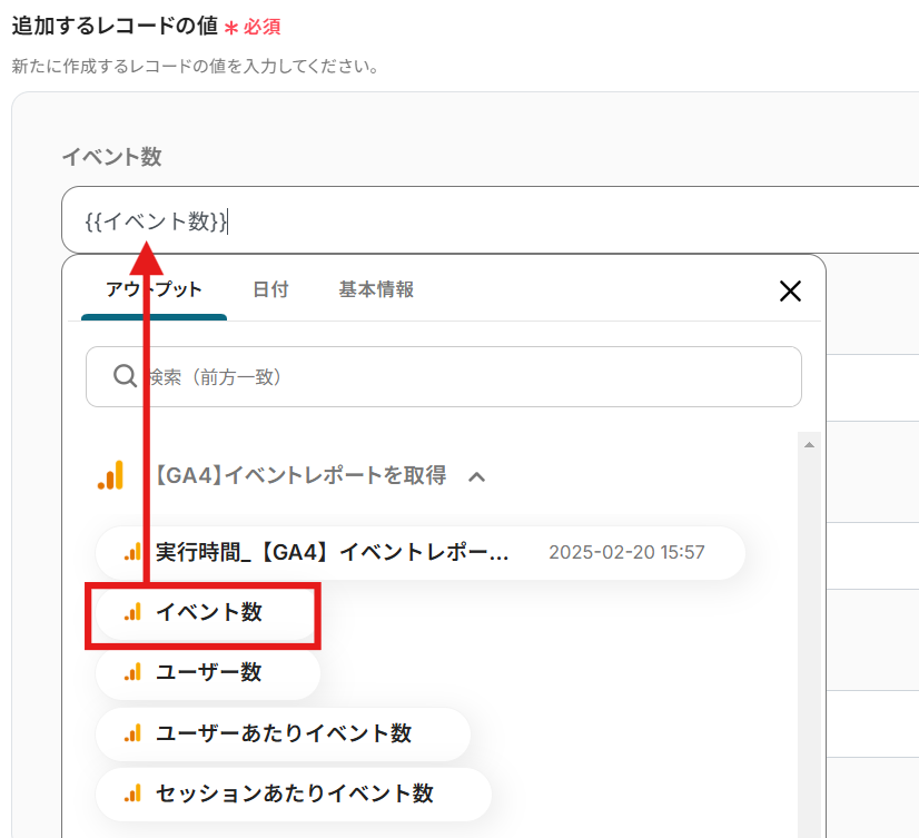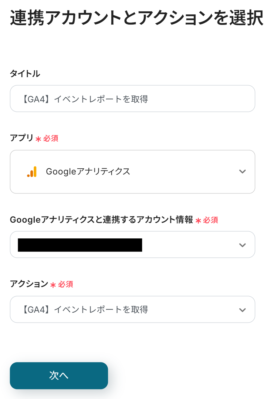 続いて、Google アナリティクスで最新のレポートを取得する設定を行うため、「【GA4】イベントレポートを取得」をクリックします。