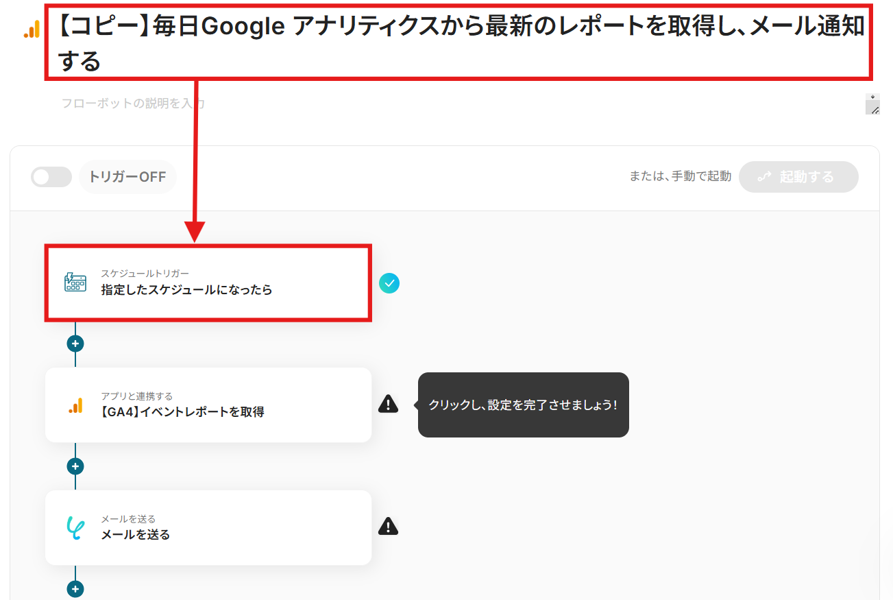こちらは、3つ目にご紹介したテンプレートから少し派生して、Google アナリティクスのレポート結果をGoogle スプレッドシートに追加し、Slackに通知するフローとなっています。