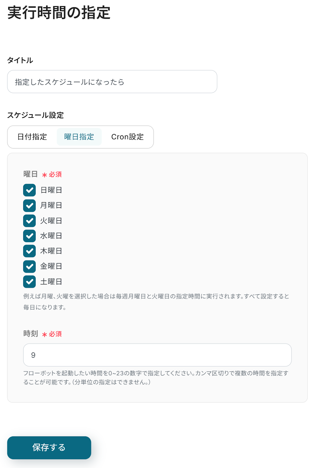 こちらでは毎日9時にフローボットが起動する想定で設定を行っています。