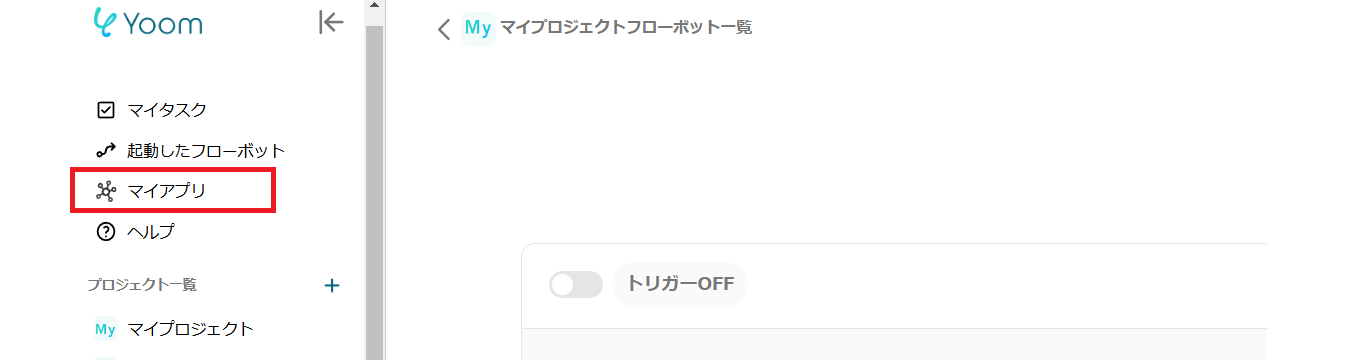 Yoomの登録完了後、左側にあるメニューから「マイアプリ」を選択してください。