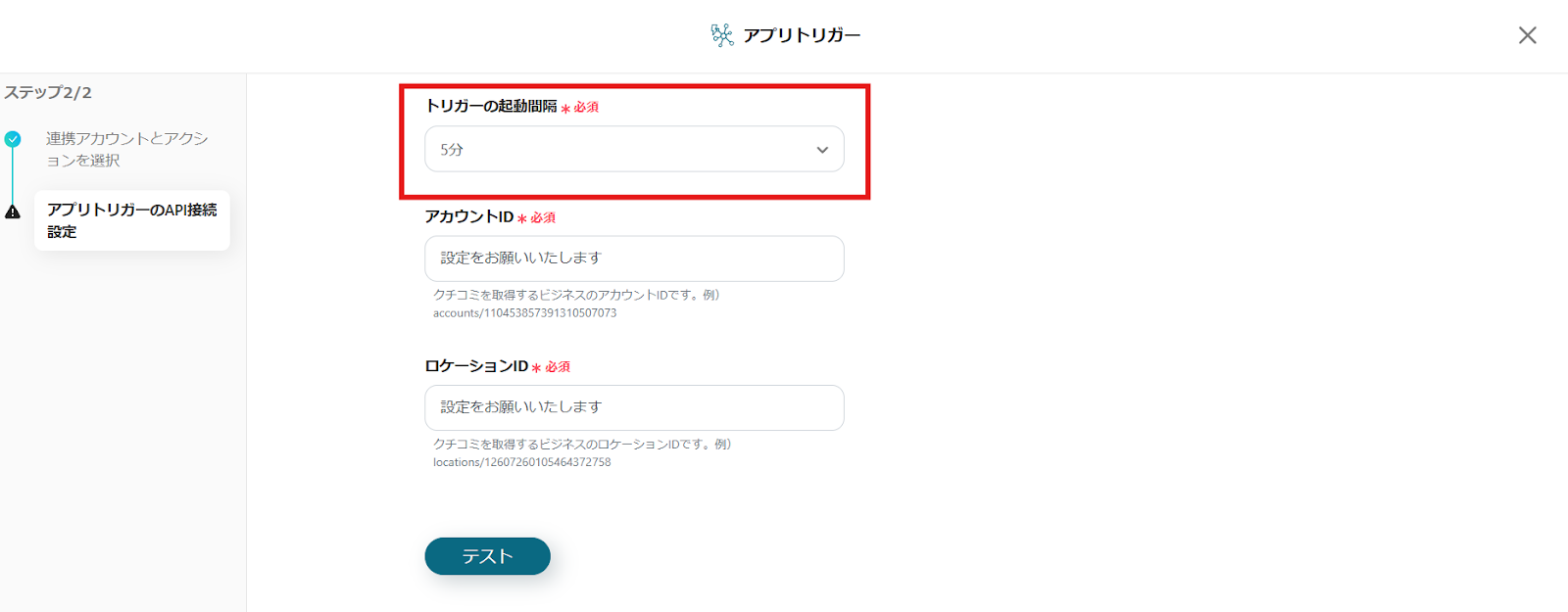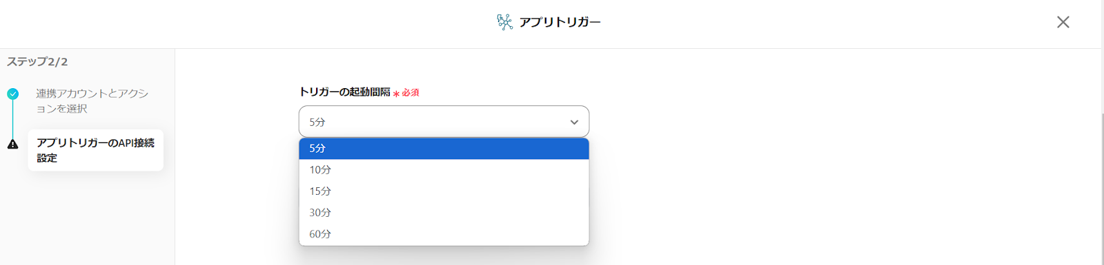 トリガーは5分、10分、15分、30分、60分の間隔で起動間隔を選択できます。