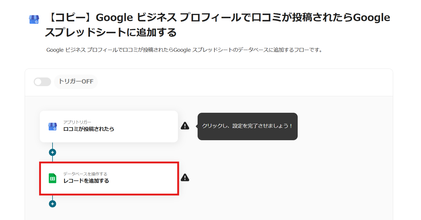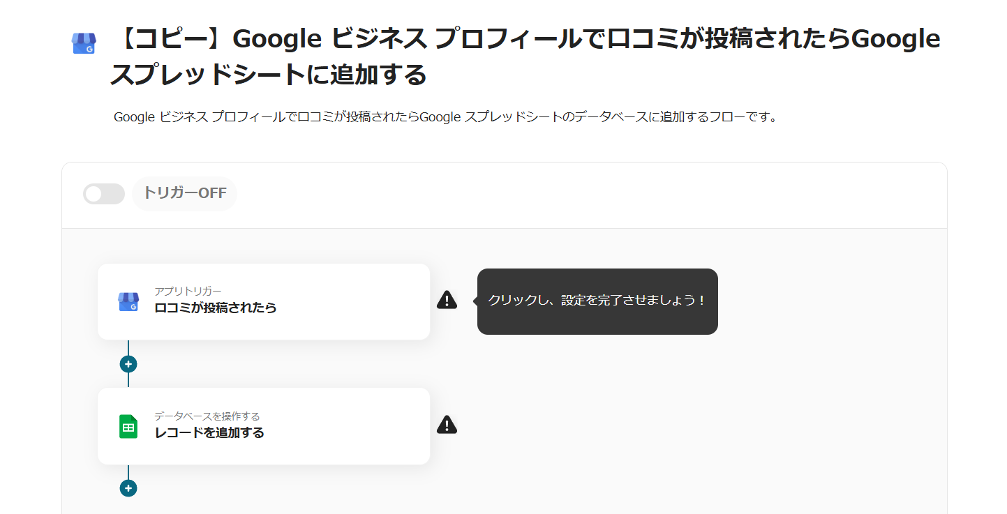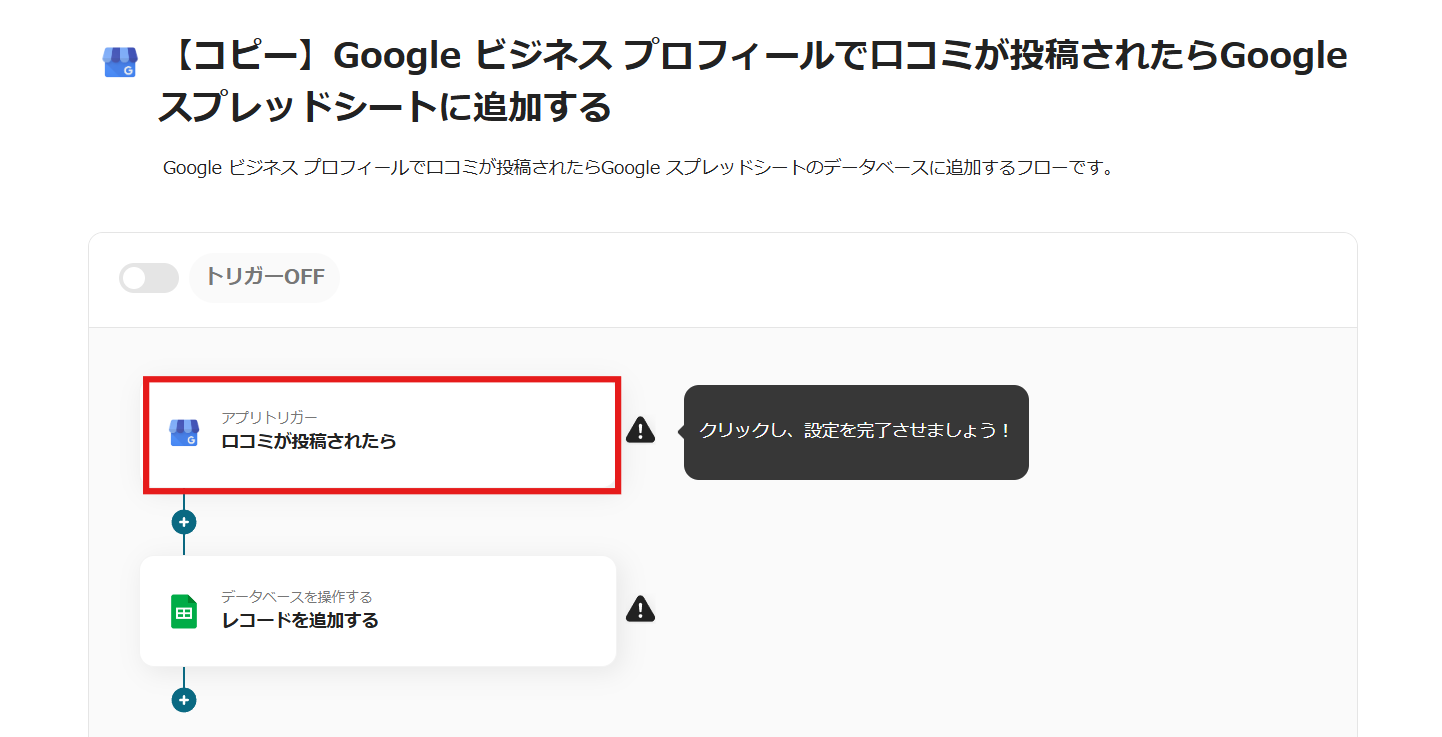 「【コピー】Googleビジネスプロフィールで口コミが投稿されたらGoogle スプレッドシートに追加する」をクリックします。