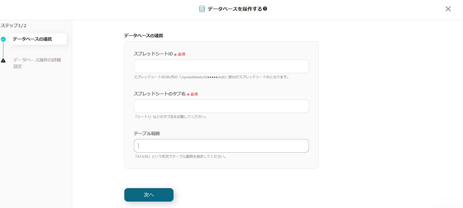 テーブル範囲に関しては用意したGoogle スプレッドシートに依存するため、Google スプレッドシートの内容に沿って入力していきましょう。