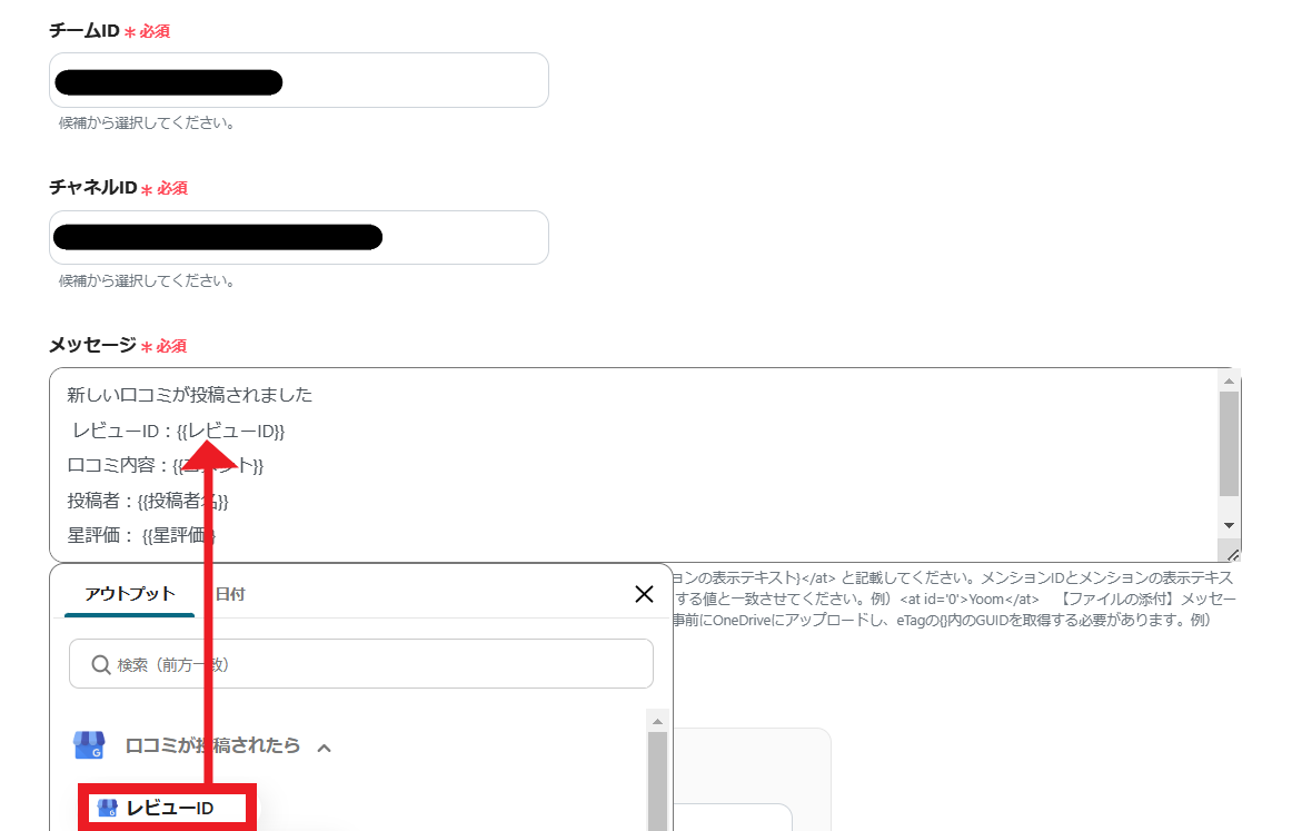 チームIDとチャネルIDは入力欄をクリックすると候補が表示されるので、活用してください。