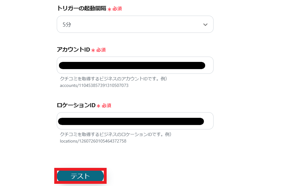 3.トリガーの起動時間、アカウントID、ロケーションIDを設定してください。