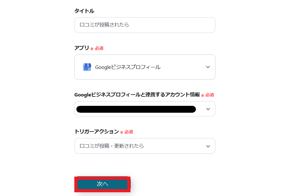 ステップ2:Google ビジネス プロフィールで口コミが投稿されたら起動するトリガーの設定