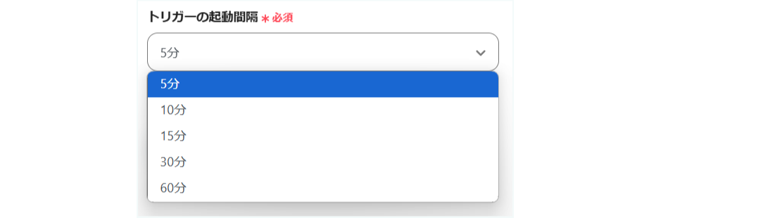 トリガーは5分、10分、15分、30分、60分の間隔で起動間隔を選択できます。
