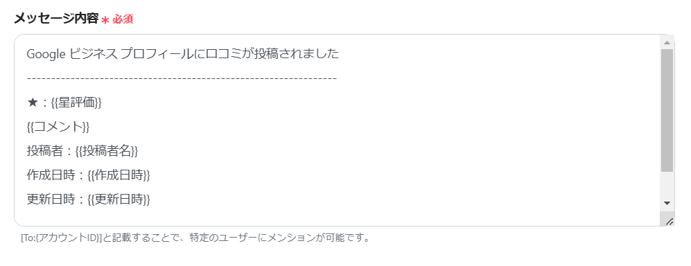 Google ビジネス プロフィールに投稿された口コミデータを通知するルームIDを設定しましょう。