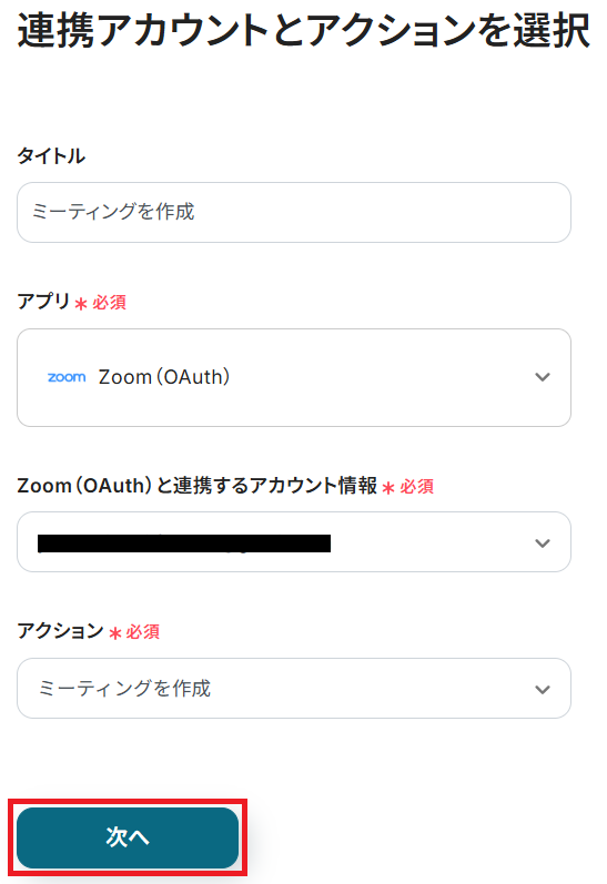 ステップ3・4と同様、アクションは「ミーティングを作成」のまま「次へ」をクリックします。