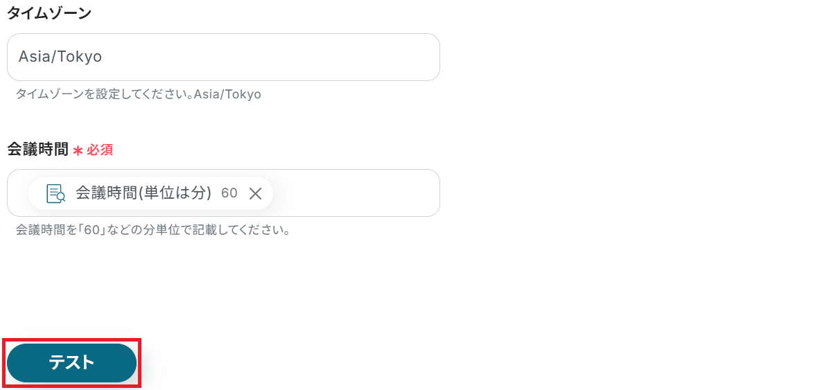 最後に任意で「種別」と「検索キーワード」を設定してテストしましょう。今回はテスト用に作成した予定に合わせて「会議」というキーワードを設定しました。