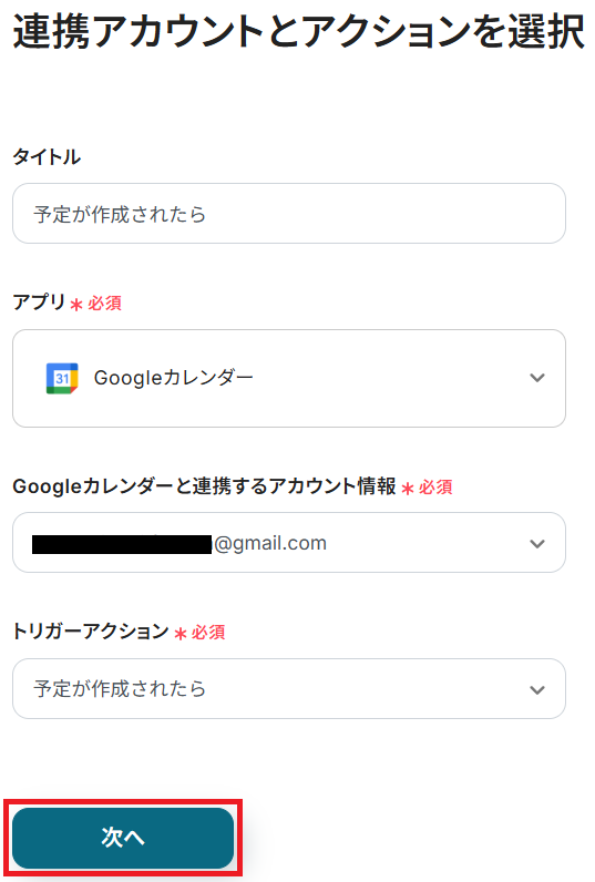 タイトルと連携するアカウント情報を任意で設定し、トリガーアクションはテンプレート通りに「予定が作成されたら」のまま「次へ」をクリックしてください。