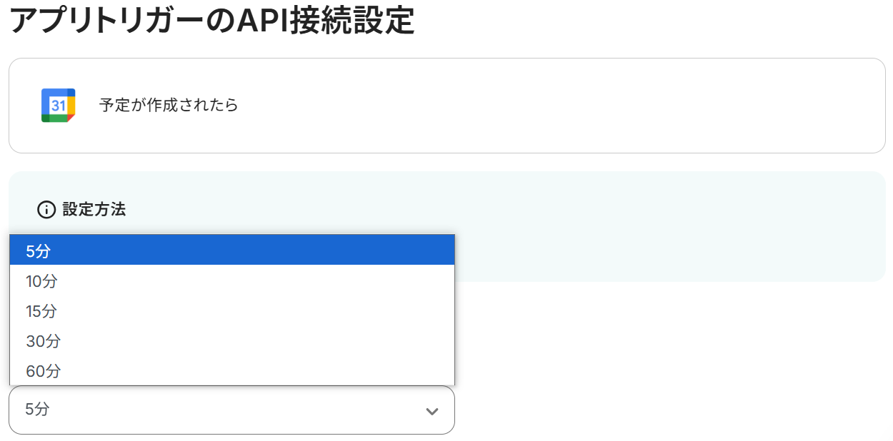 アプリトリガーのAPI接続設定という画面が表示されるので、まず「トリガーの起動間隔」をプルダウンから選択しましょう。