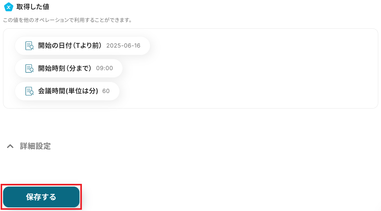 成功したら保存してください。ここで取得したアウトプットの値は次以降のステップで活用します。