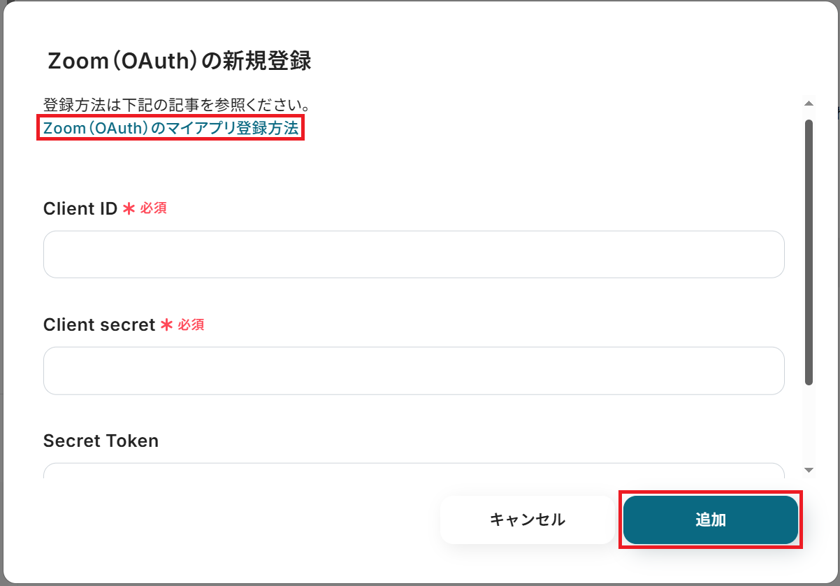 Zoomも先ほどのGoogleカレンダーと同様「マイアプリ」から検索しましょう。「Zoom(OAuth)のマイアプリ登録方法」を参考にClient ID・Client secret・(任意で)Secret Tokenを入力し「追加」をクリックするとマイアプリ連携が完了します。