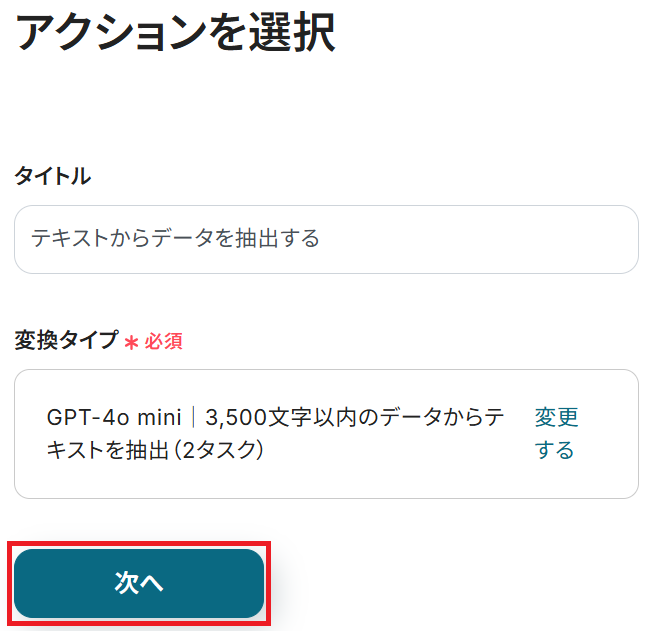 用途に合わせてAIのアクションを選択(モデルも選択可能)して、「次へ」をクリックします。