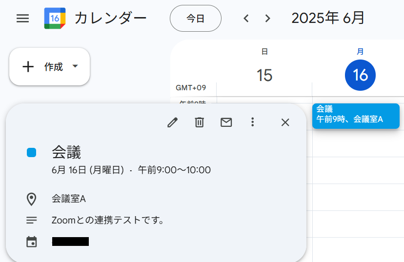 まず準備として、Googleカレンダーでテスト用の予定を作成しておきましょう。今回は例として会議の予定を作成しました。
