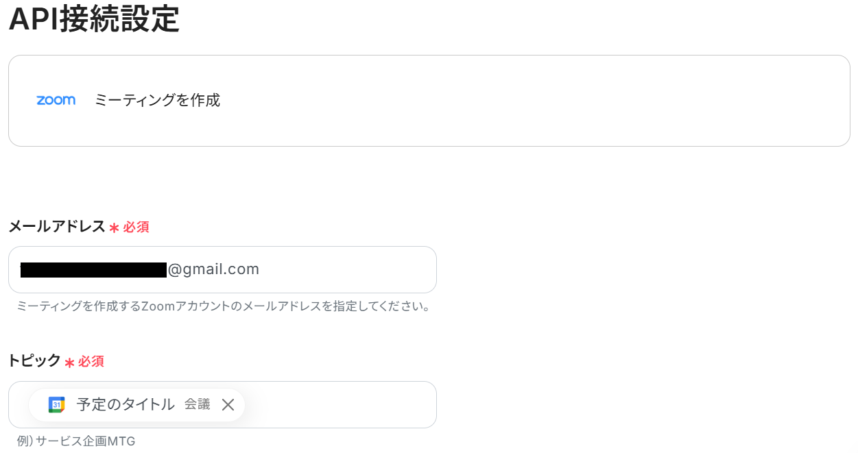 API接続設定に移るので、まずZoomでお使いのメールアドレスを入力しましょう。「トピック」は予め設定されている「予定のタイトル」のアウトプットで大丈夫です。