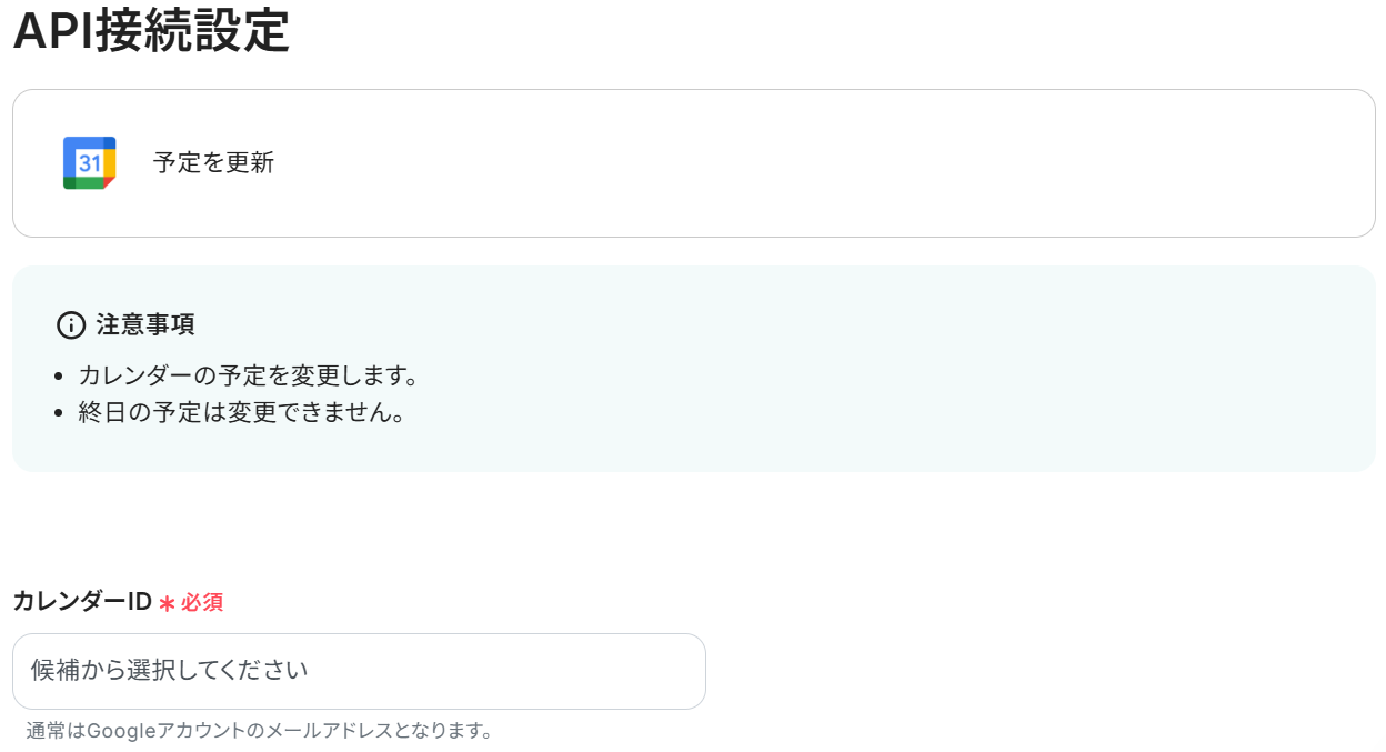 API接続設定に移るので、まずステップ3と同様に「カレンダーID」を選択してください。