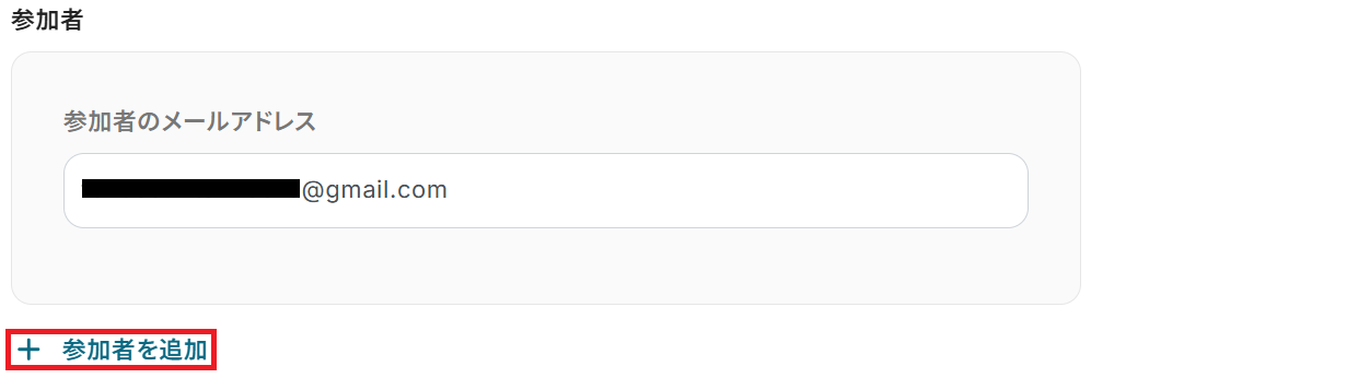 「参加者」にメールアドレスを入力すると、会議の参加者を登録できます。「+ 参加者を追加」から複数人追加することも可能です。