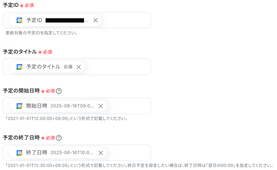 「予定ID」~「予定の終了日時」は予め設定されている通りでOKです。