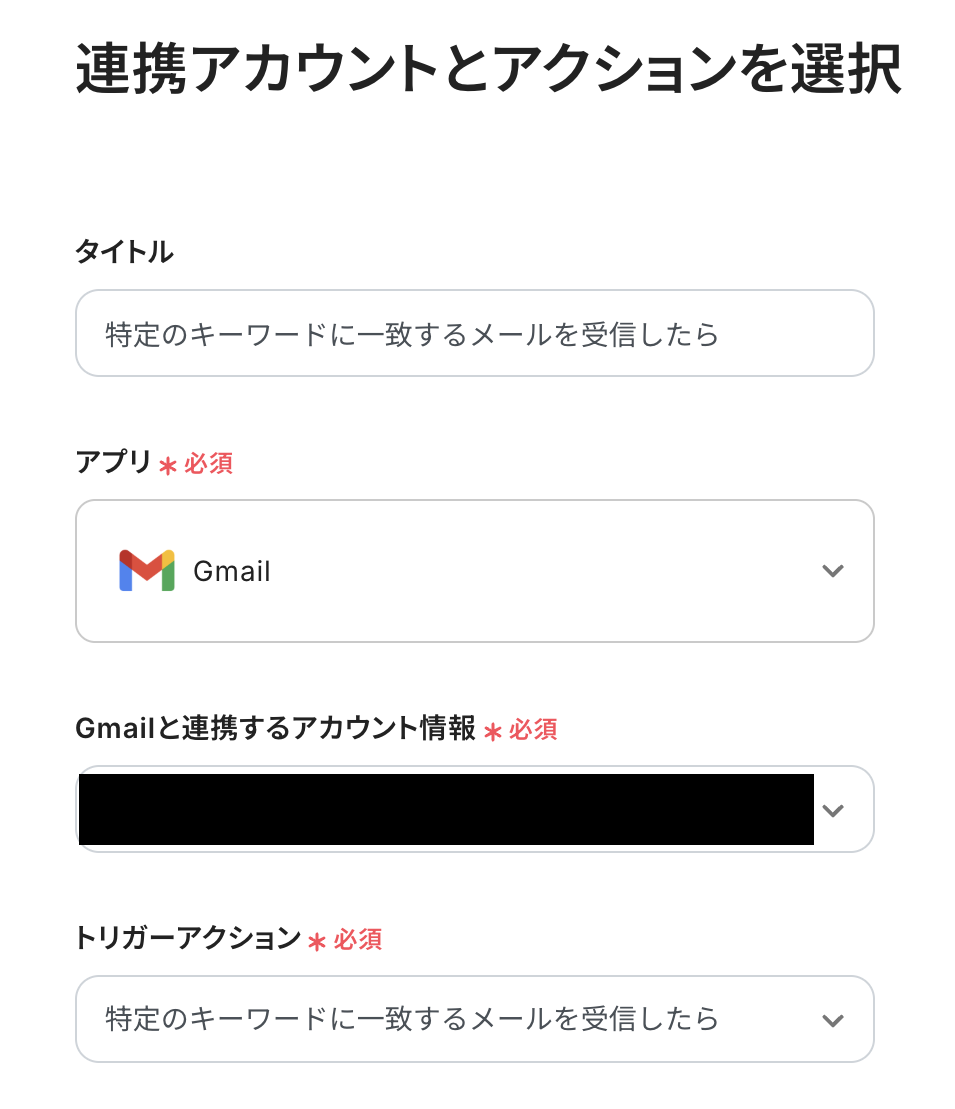 必要箇所を入力していきます。 「タイトル」:必要に応じて変更可能 「Gmailと連携するアカウント情報」:合っているか確認 「トリガーアクション」:「特定のキーワードに一致するメールを受信したら」を選択