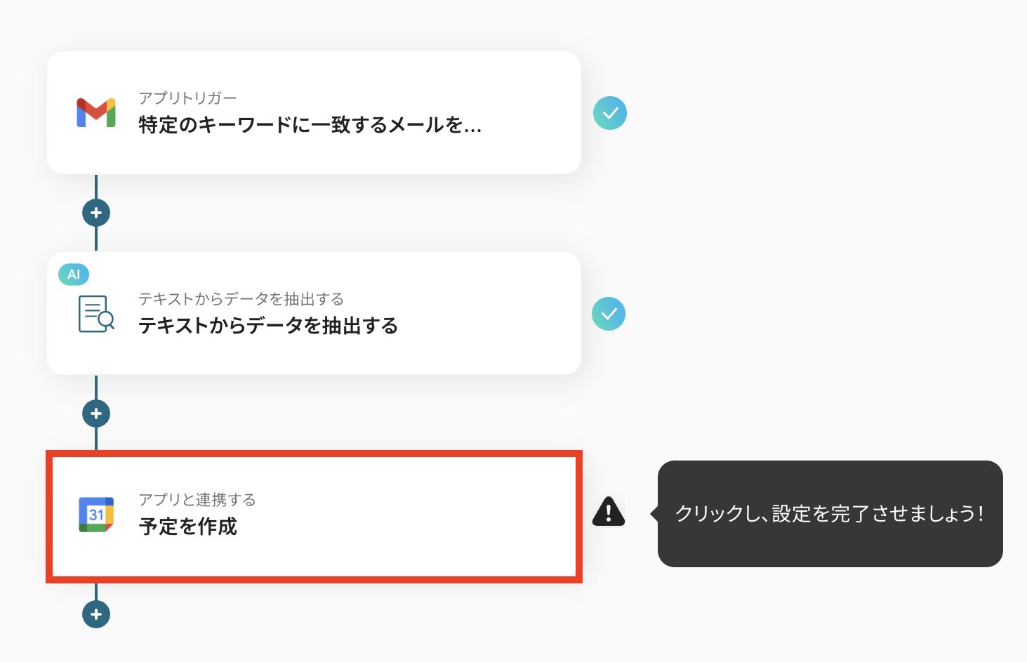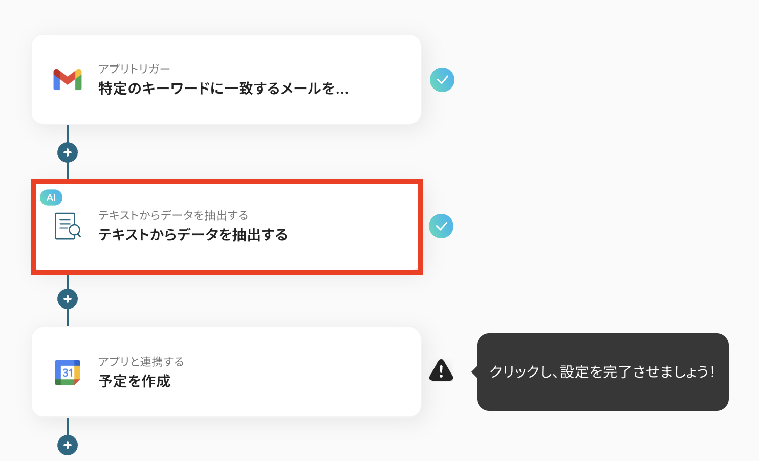 AI機能の「テキストからデータを抽出する」では、受信するメールのフォーマットに合わせて、件名や本文から抽出したい項目(日時、場所、参加者など)を任意に設定してください。 Googleカレンダーの「予定を作成」では、予定のタイトルや説明欄に、前段のAI機能で抽出した情報を動的な値として設定したり、固定のテキストを追加したりすることが可能です。 ■注意事項