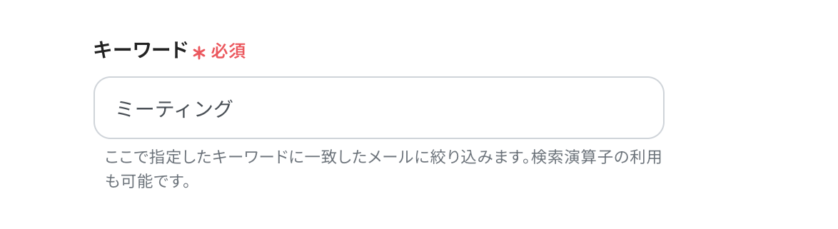 Gmailのトリガー設定では、特定の送信元メールアドレスを指定したり、件名や本文に含まれるキーワードを「会議」や「打ち合わせ」のように任意で設定したりすることが可能です。 AI機能によるテキスト抽出では、トリガーで受信したメールの本文を変数として設定し、その中から「会議名」「日時」「場所」といった項目を任意で指定して抽出できます。 ■注意事項