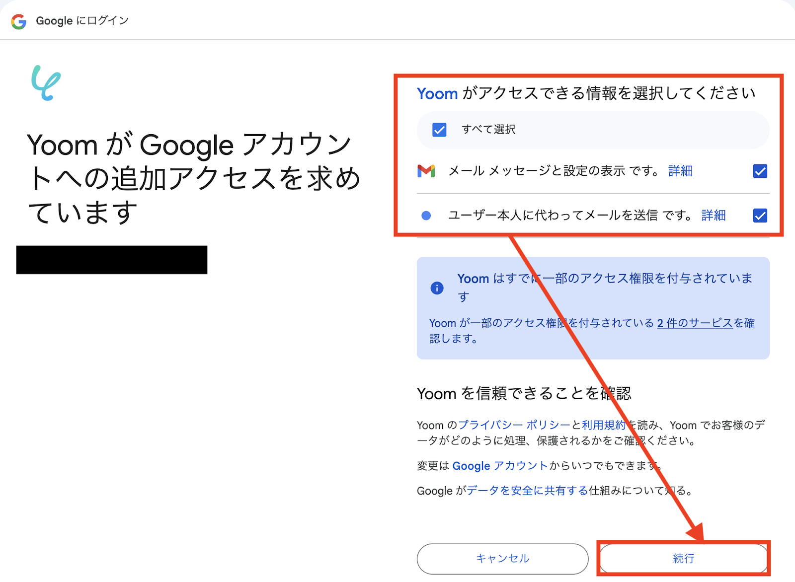 アクセス権限を付与する範囲にチェックを入れて「続行」を押すと、連携完了です!