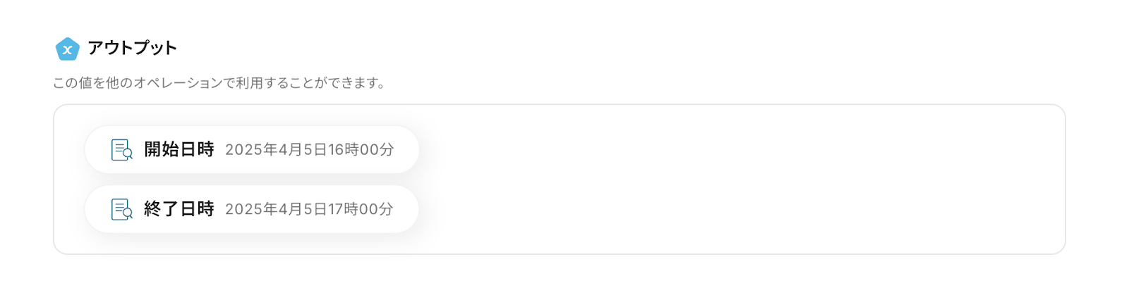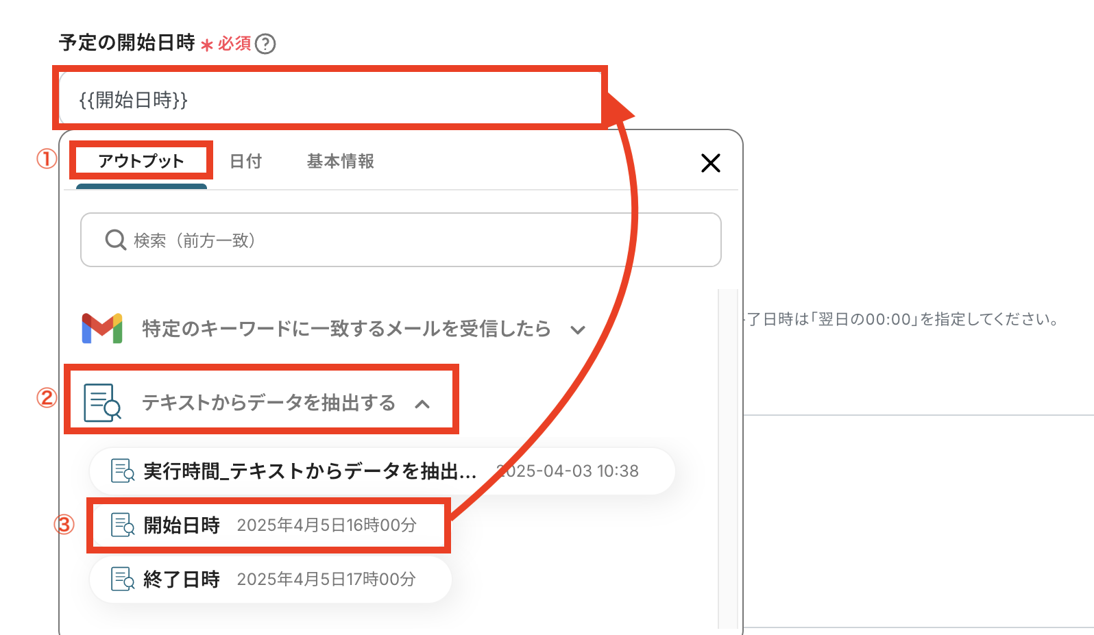「予定の開始日時」と「予定の終了日時」はステップ4で抽出したアウトプットを活用します。 ※日付の入力形式はこちら をご確認ください。 (今回は自動変換可能な形式である「◯月◯日◯時◯分」を使用しています!)
