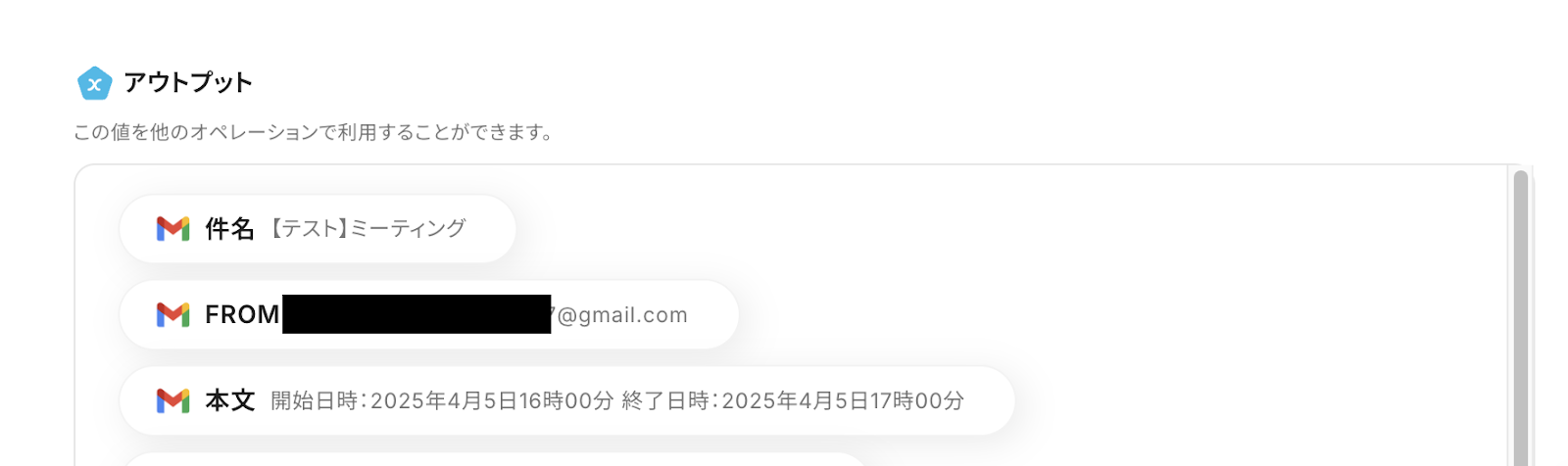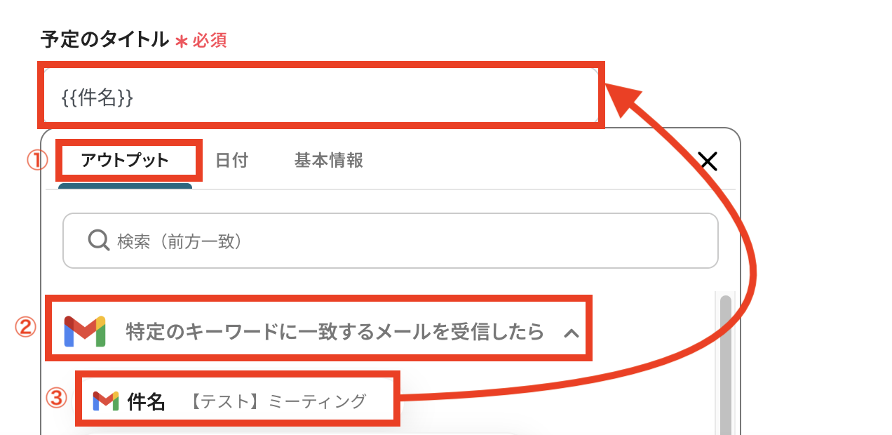 「予定のタイトル」はアウトプットを活用します。 今回はGmailの件名をタイトルにしていますが、必要に応じて変更してください。