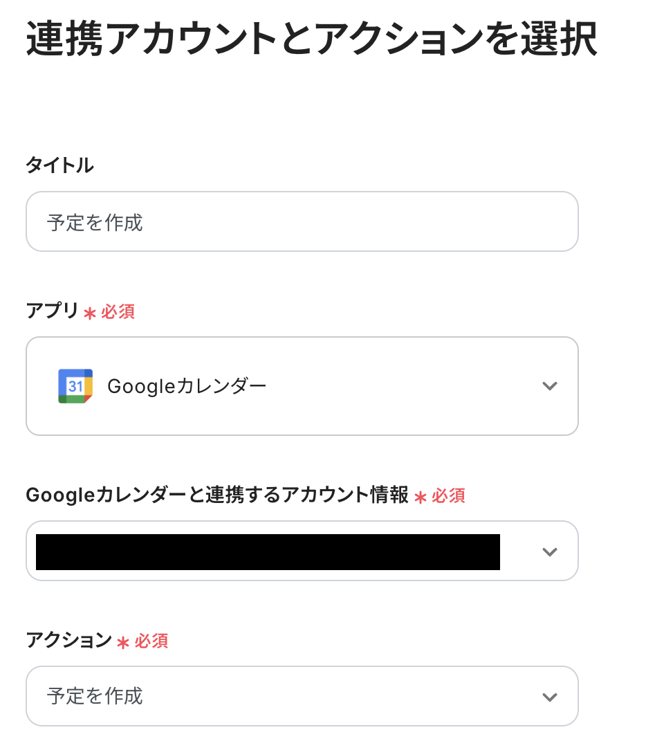 必要箇所を入力していきます。 「タイトル」:必要に応じて変更可能 「Googleカレンダーと連携するアカウント情報」:合っているか確認 「アクション」:「予定を作成」を選択