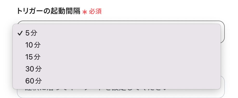 「トリガーの起動間隔」を5分・10分・15分・30分・60分から選択します。 早めにGoogleカレンダーに書き込みたい場合は、短い間隔で設定しましょう! ※プラン によって起動間隔の選択内容が異なるため、ご注意ください。