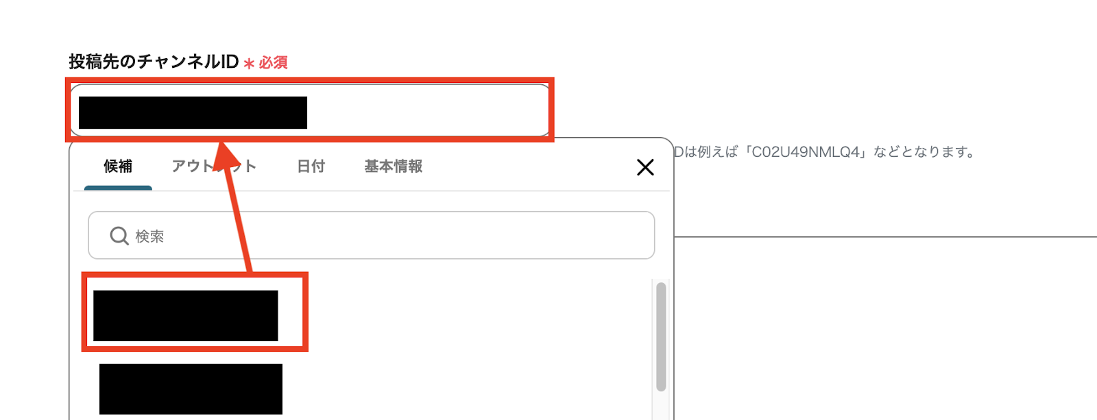 次に「投稿先のチャンネルID」を選択していきますが、事前に送信先のチャンネルにYoomのアプリを追加する必要があります。