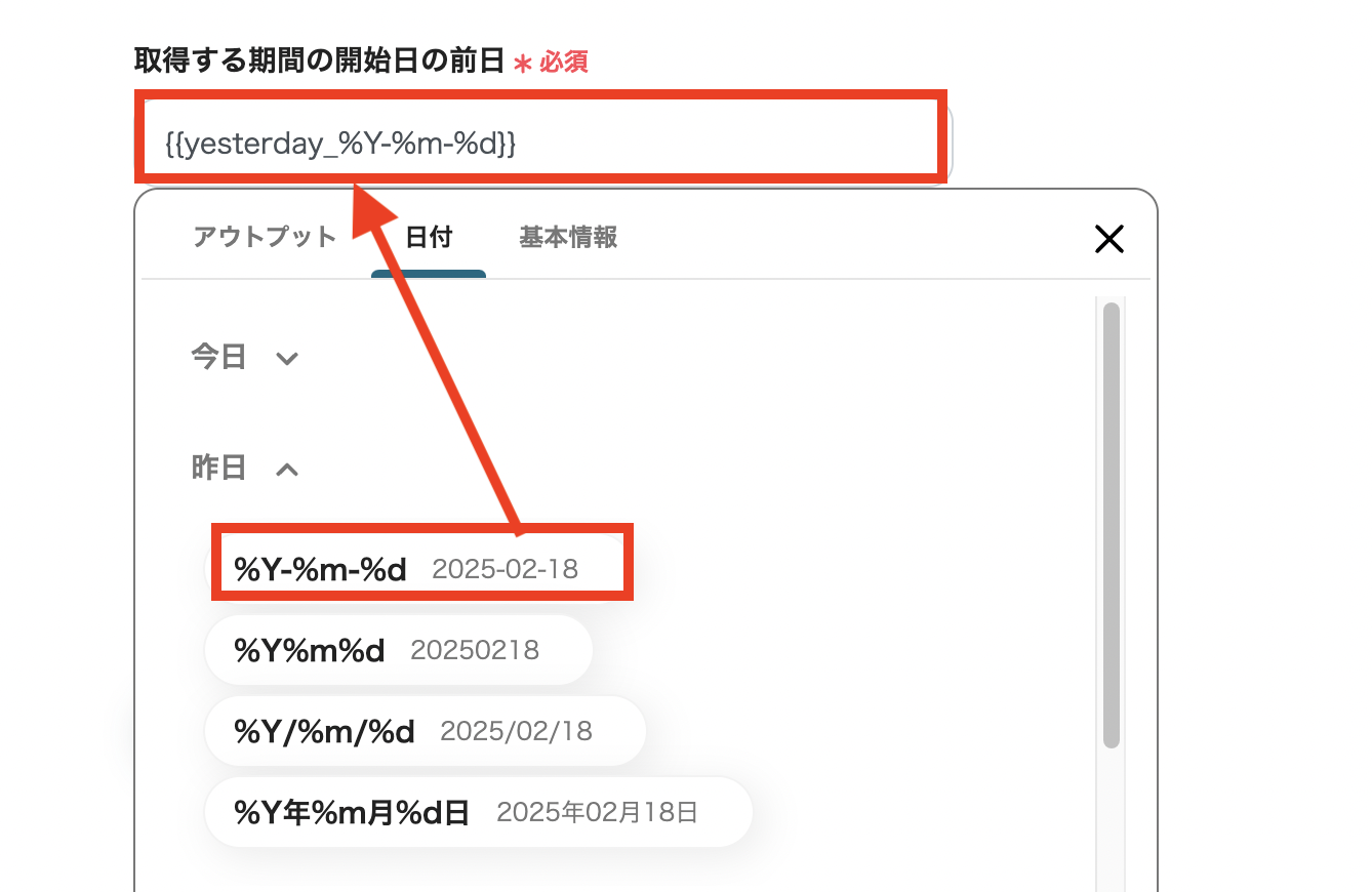 フォーマットに「取得する期間の開始日の前日」と「取得する期間の終了日が入力されているため、このまま変更しなくてOKです!