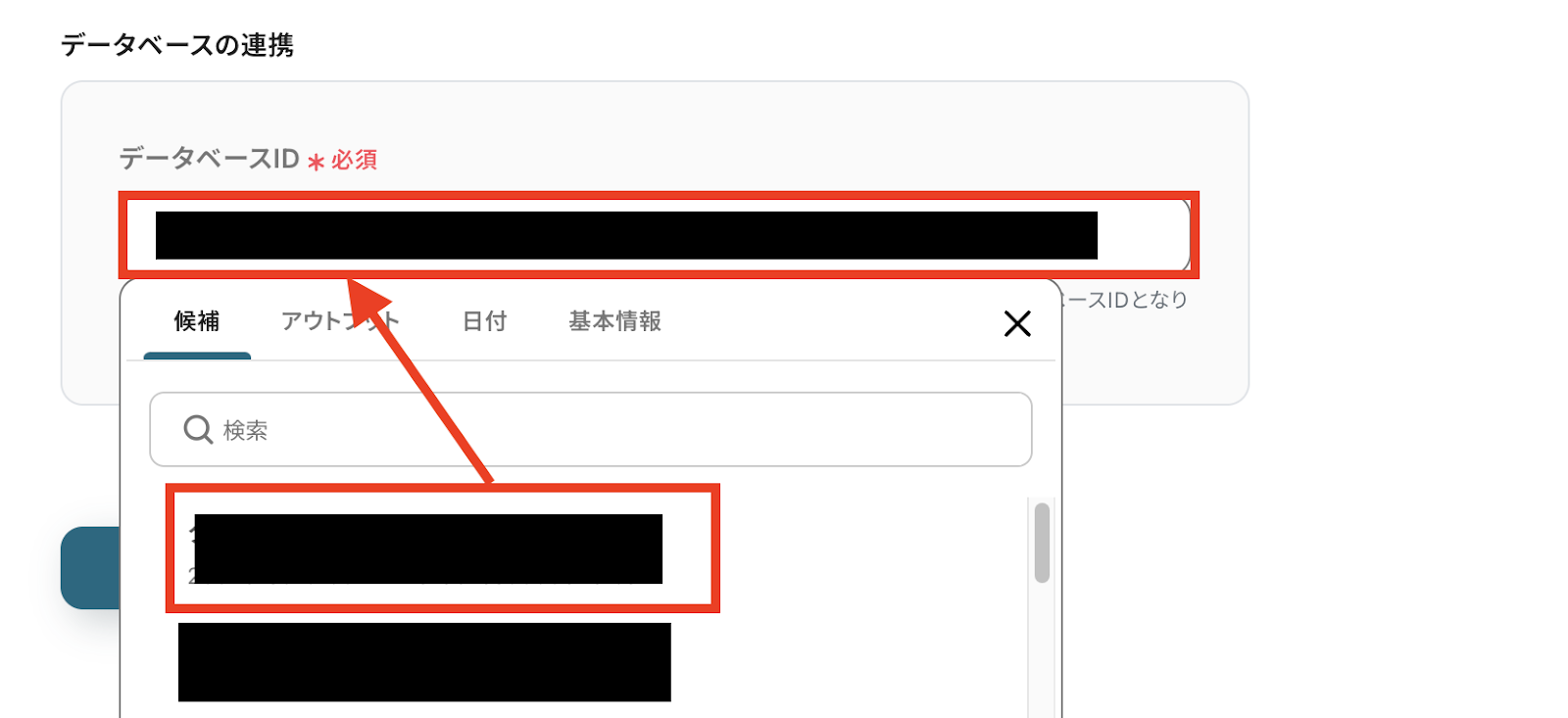 Notionと連携するアカウント情報が合っていることを確認したら、連携する「データベースID」を候補から選びましょう!