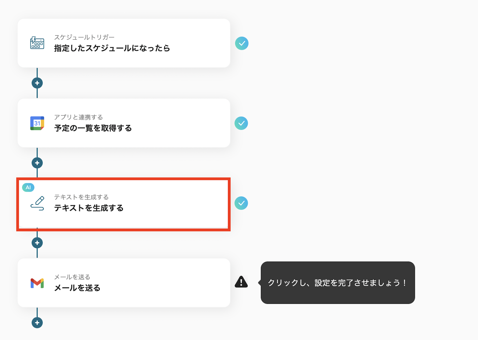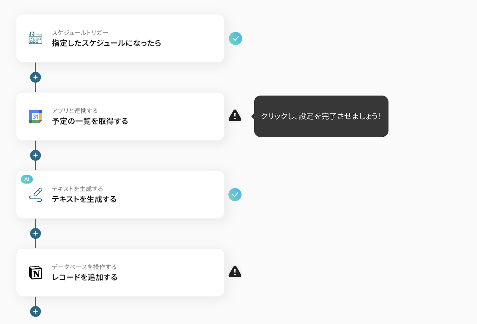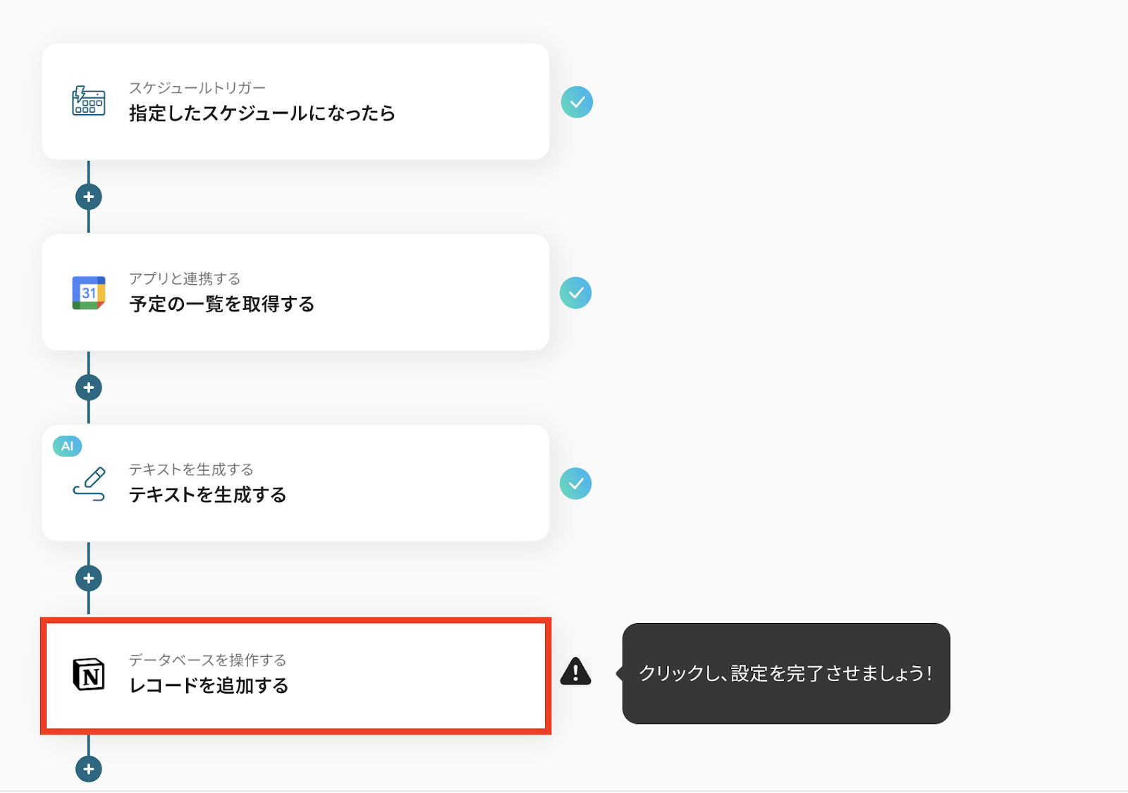 スケジュールトリガーからAI機能によるテキスト生成までの設定完了後「レコードを追加する」をクリックします。