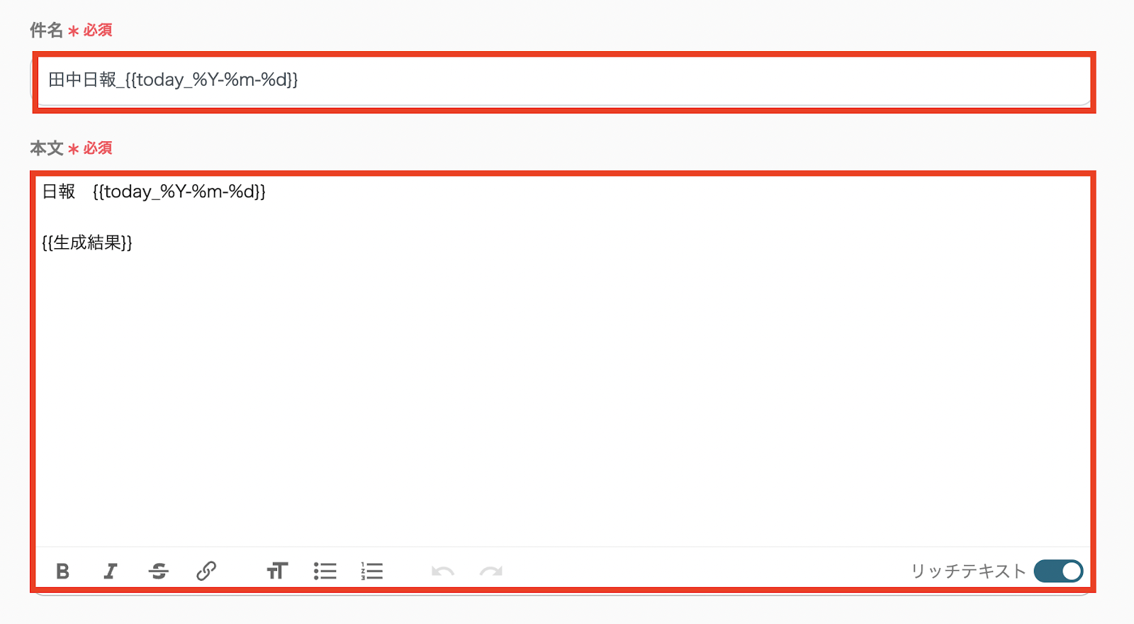 テンプレートでは件名に「送信者の名前・日報・送信する日の日付」が入っていますね!