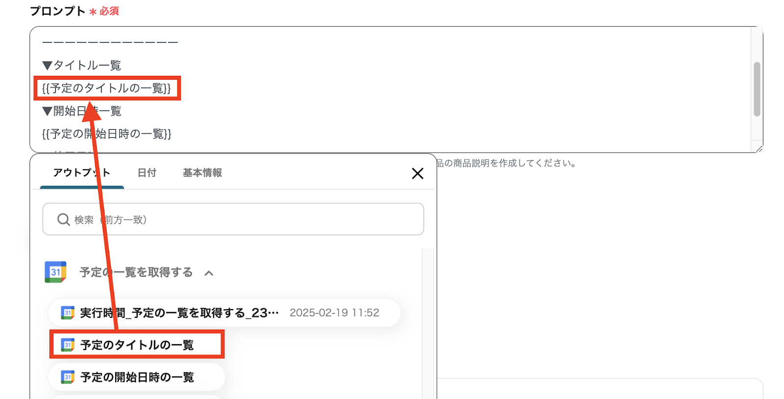 「アクション」:「予定の一覧を取得する」を選択