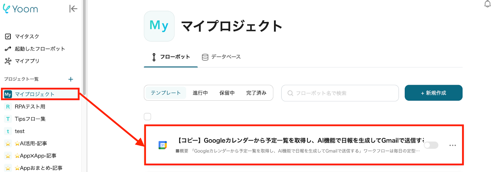 左側にあるメニューの「マイプロジェクト」から、コピーしたテンプレートを開きます。